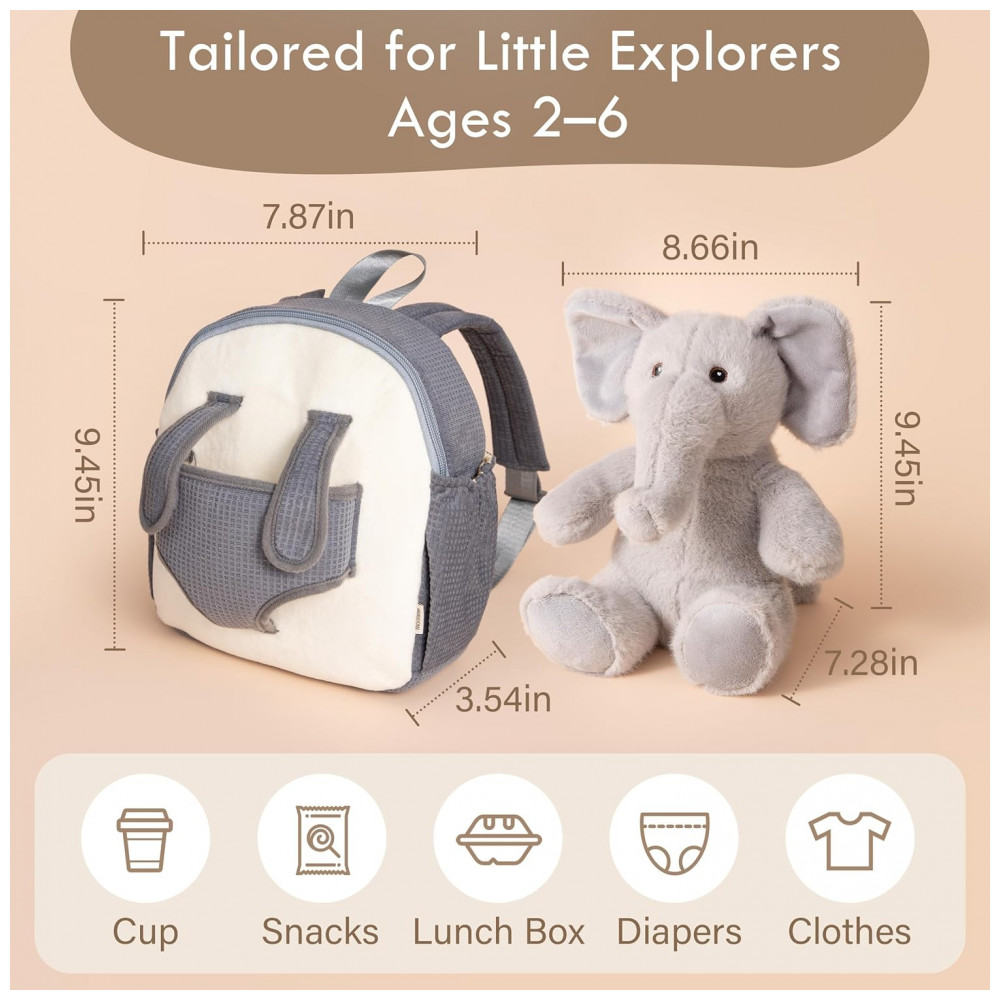 A mochila possui cerca de 25 cm de altura, com alças de ombro acolchoadas e ajustáveis para se adaptar ao corpo infantil, além de zíperes de fácil deslizamento. O elefante de pelúcia acompanha o conjunto preso à mochila e pode ser destacado para brincadeiras e momentos de aconchego, incentivando a criança a levar seus próprios itens com autonomia em saídas diárias.