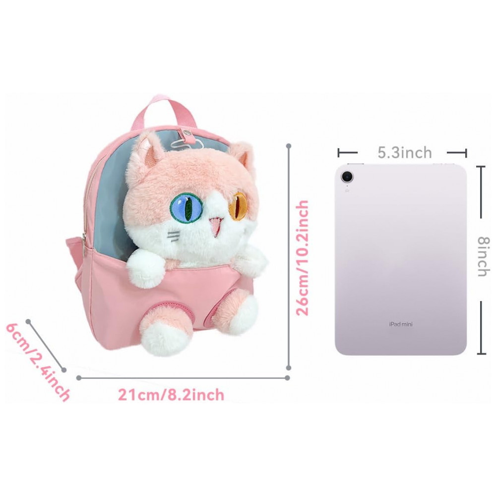 Mochila infantil compacta com pelúcia de gatinho removível, indicada para meninas de aproximadamente 3 a 6 anos, ideal para uso em pré‑escola, creche, passeios e viagens curtas. O corpo da mochila combina náilon e tecido peluciado macio, permitindo lavagem em máquina em água fria até 30 °C (em saco de lavagem), o que facilita a remoção de sujeiras do uso diário.