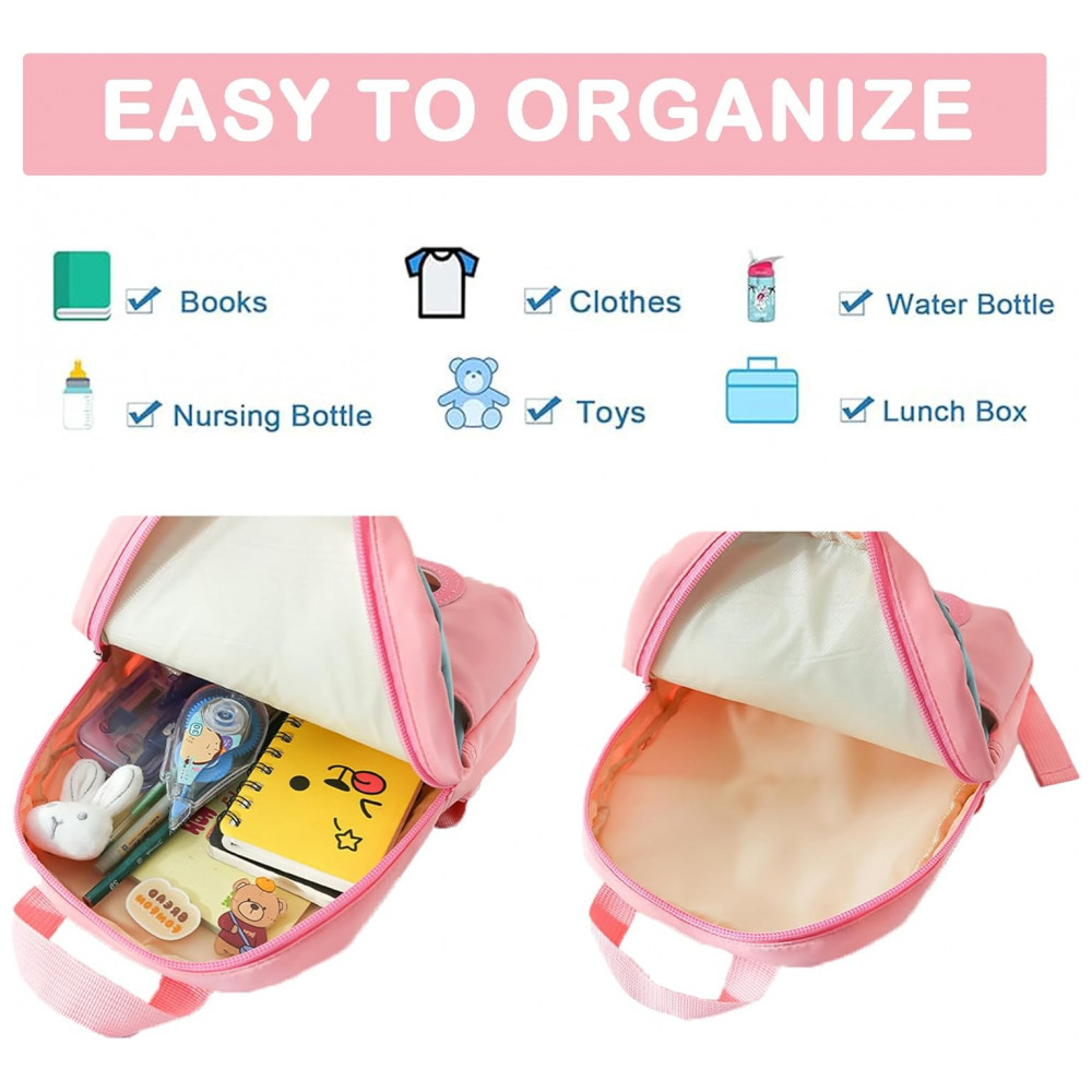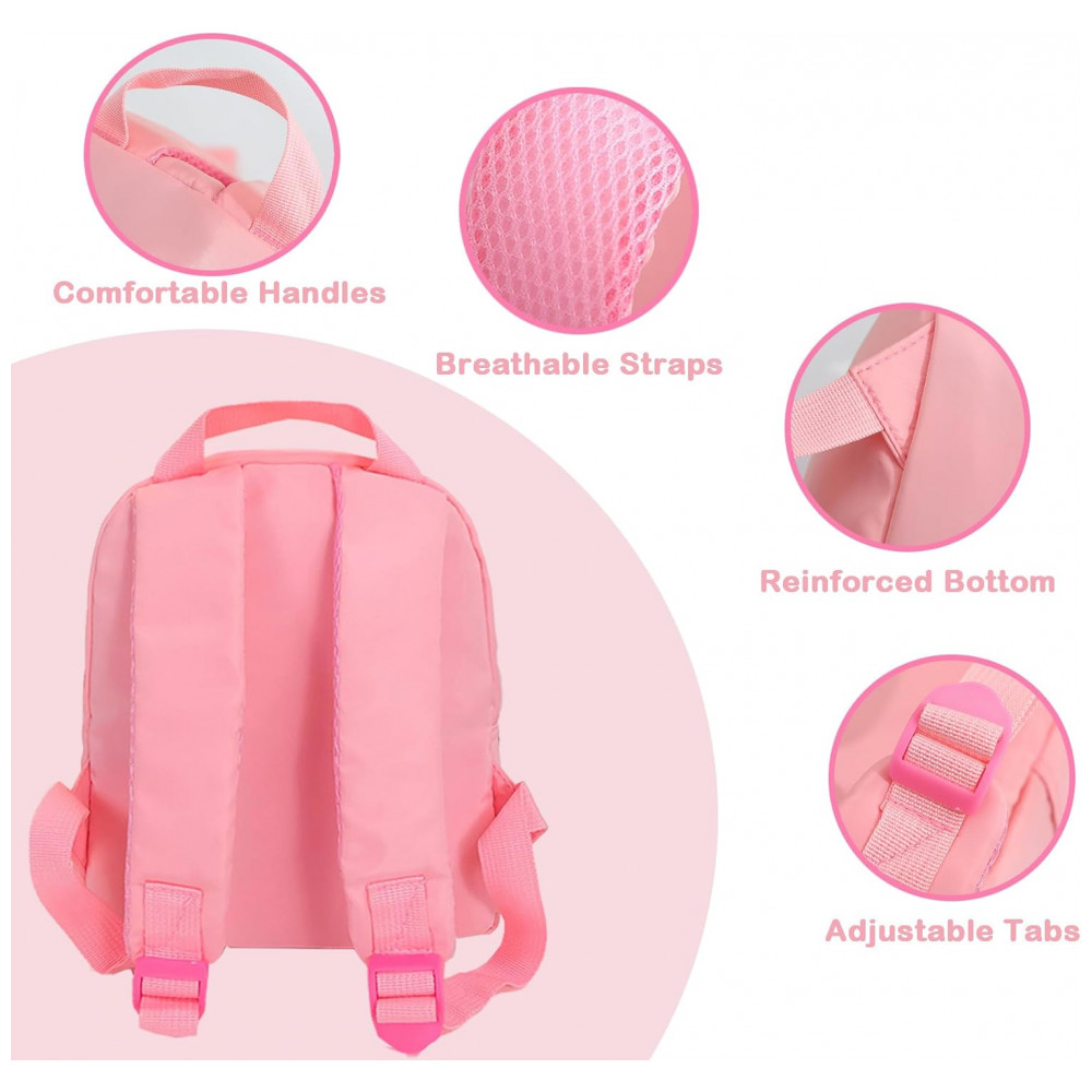 O compartimento principal, com cerca de 21 cm de largura, 6 cm de profundidade e 26 cm de altura, comporta livrinhos, um pequeno tablet, garrafa pequena, fraldas e brinquedos. As alças de ombro possuem acolchoamento em malha respirável e são ajustáveis, oferecendo conforto para uso contínuo, enquanto a pelúcia de gato pode ser destacada para brincar separadamente ou substituída por outro brinquedo favorito da criança.