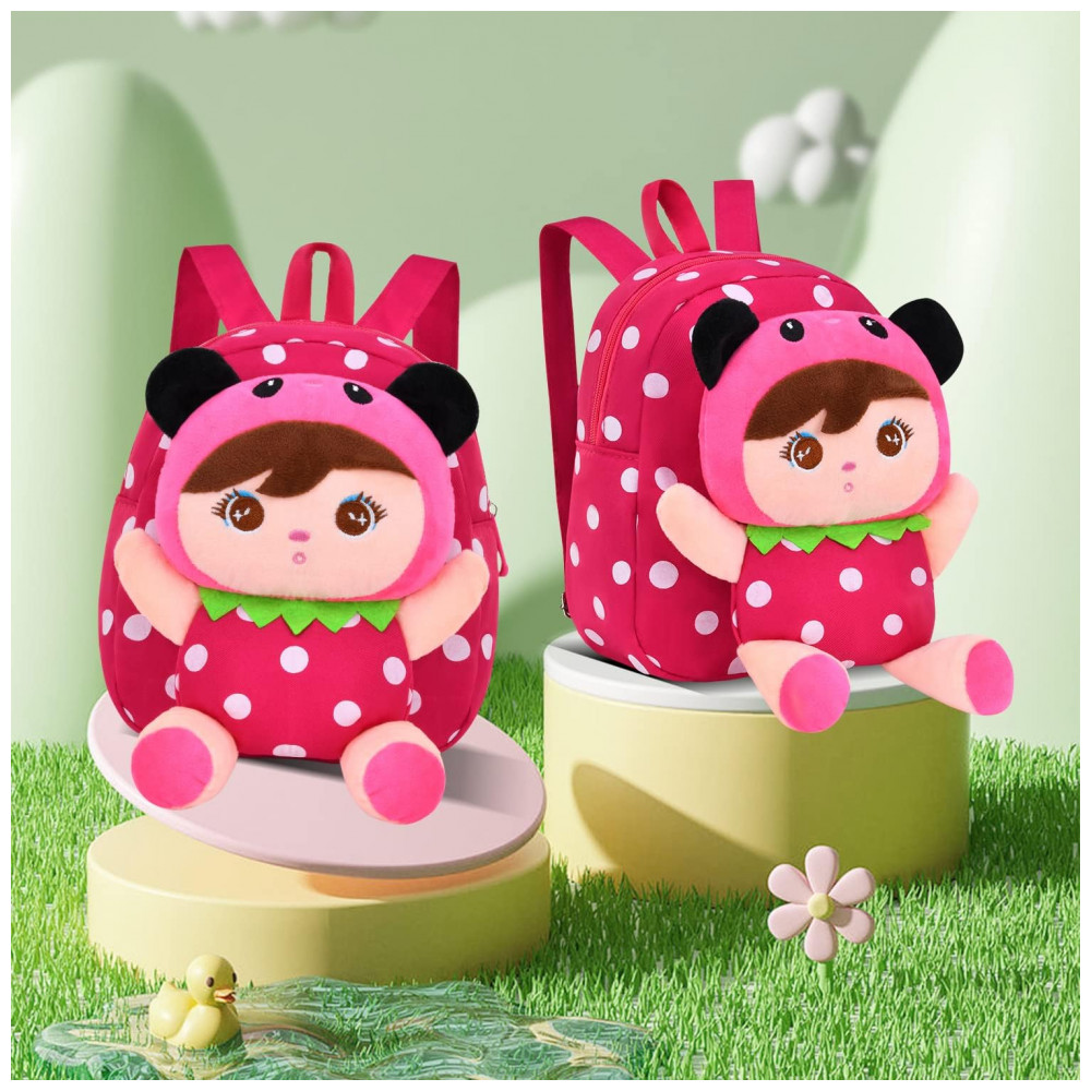 Mochila infantil compacta em lona com boneca de pelúcia na parte frontal, indicada para crianças de aproximadamente 1 a 5 anos para uso em creche, pré‑escola, passeios e pequenas viagens. O corpo da mochila utiliza canvas resistente com forro interno macio, oferecendo espaço para lanchinhos, brinquedos pequenos, livros infantis e outros itens de uso diário.