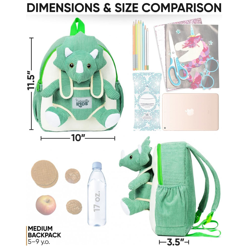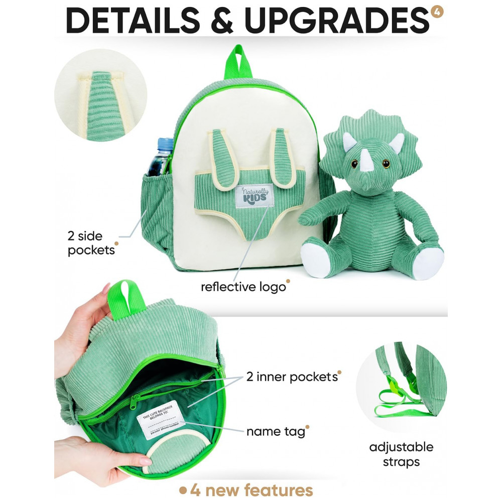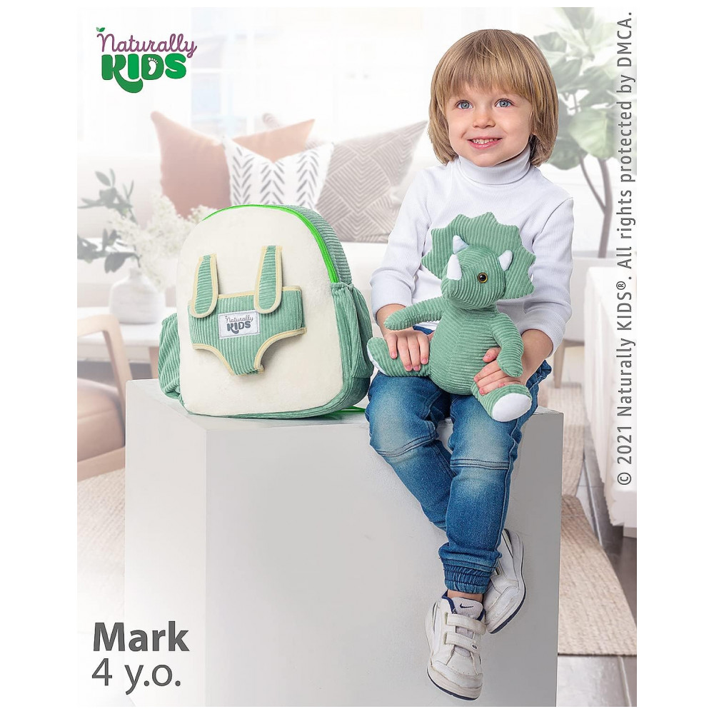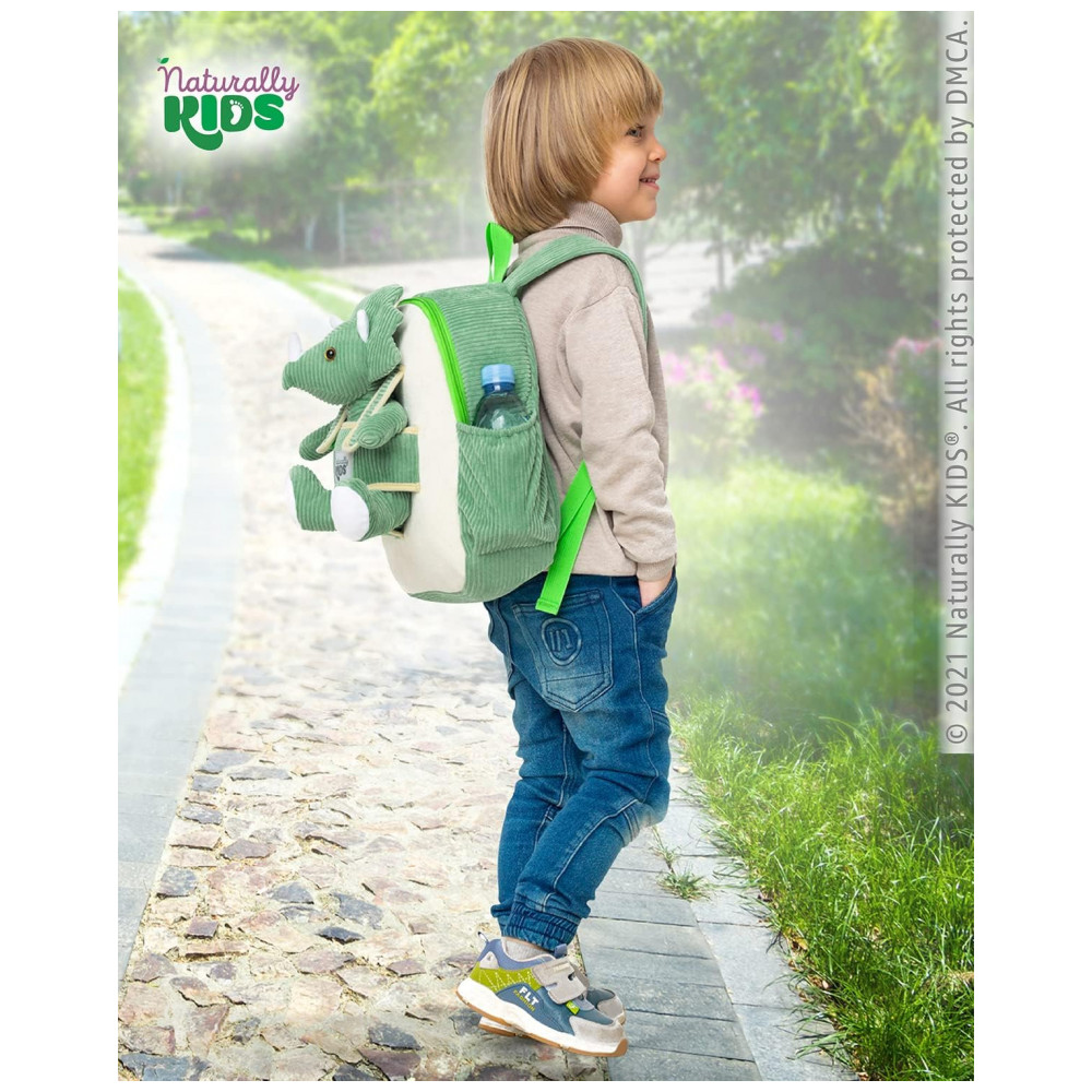 A mochila infantil Naturally KIDS verde com tema de dinossauro Triceratops foi desenvolvida para crianças pequenas, com tamanho adequado para uso em passeios, escola infantil e atividades do dia a dia. O design inclui um dinossauro de pelúcia removível acoplado à parte frontal, permitindo que a criança use tanto a mochila quanto o brinquedo separadamente como companheiro de brincadeiras ou viagens.