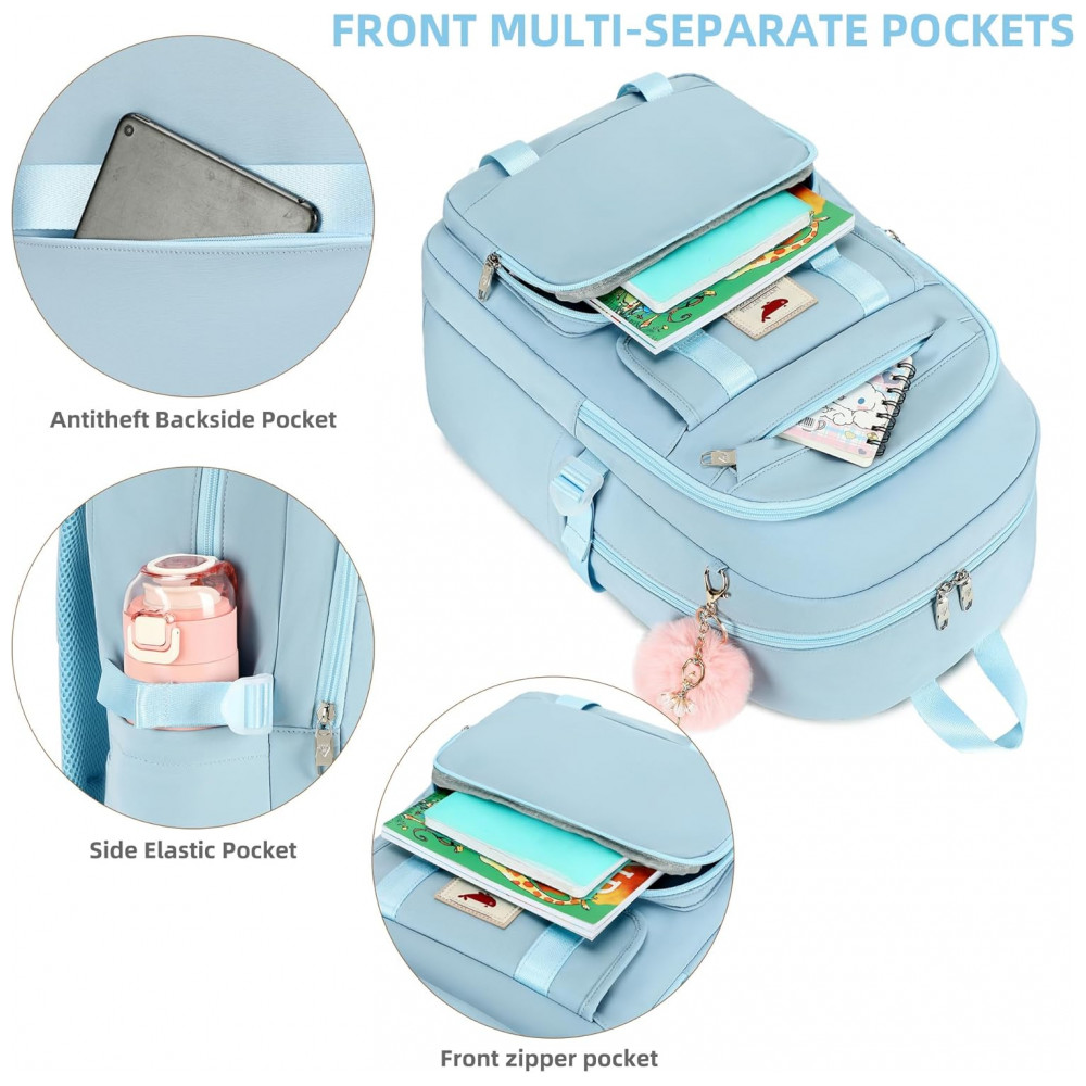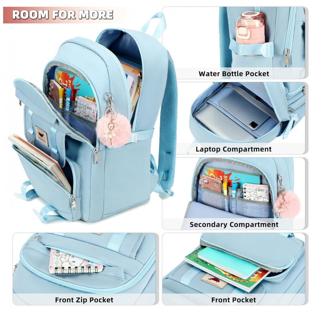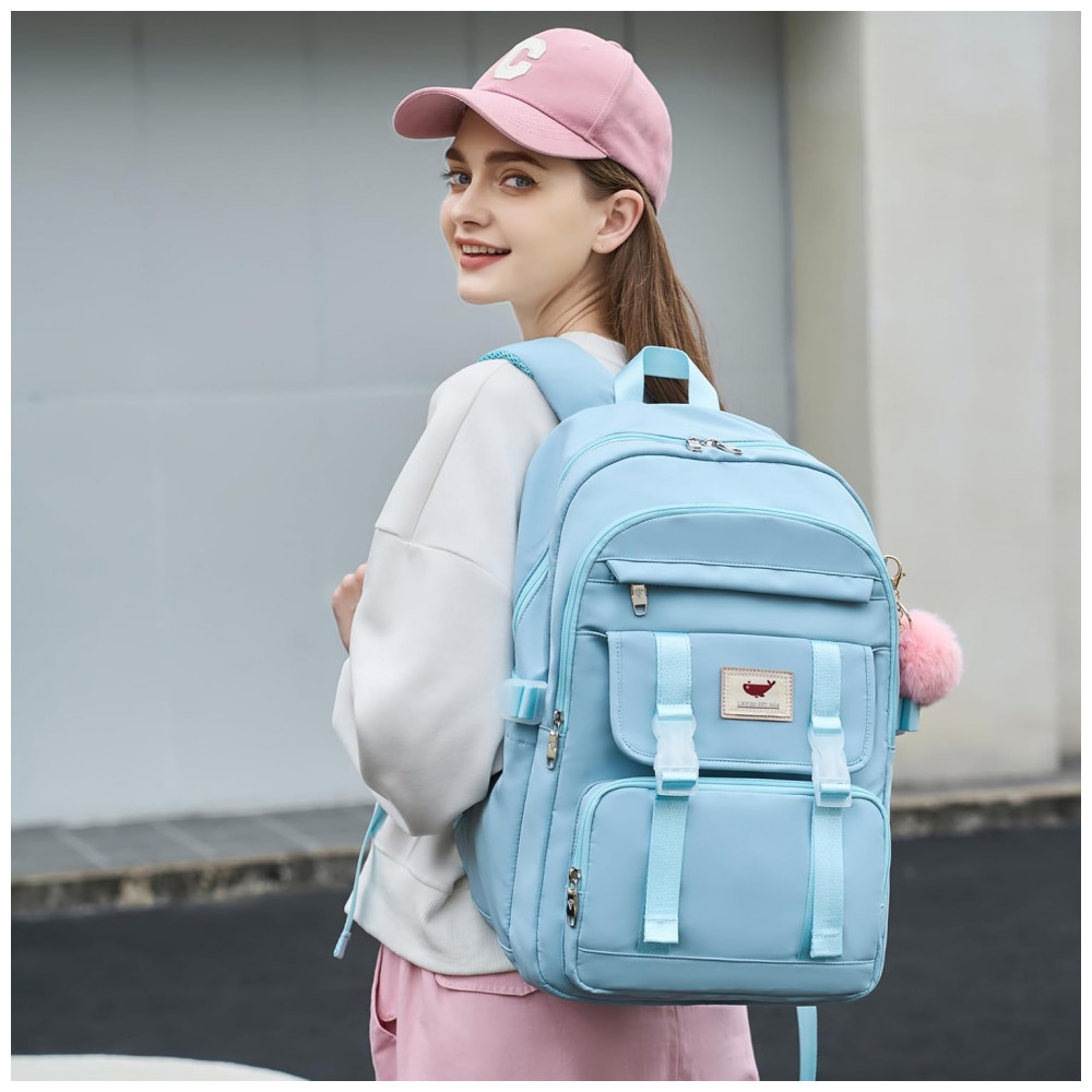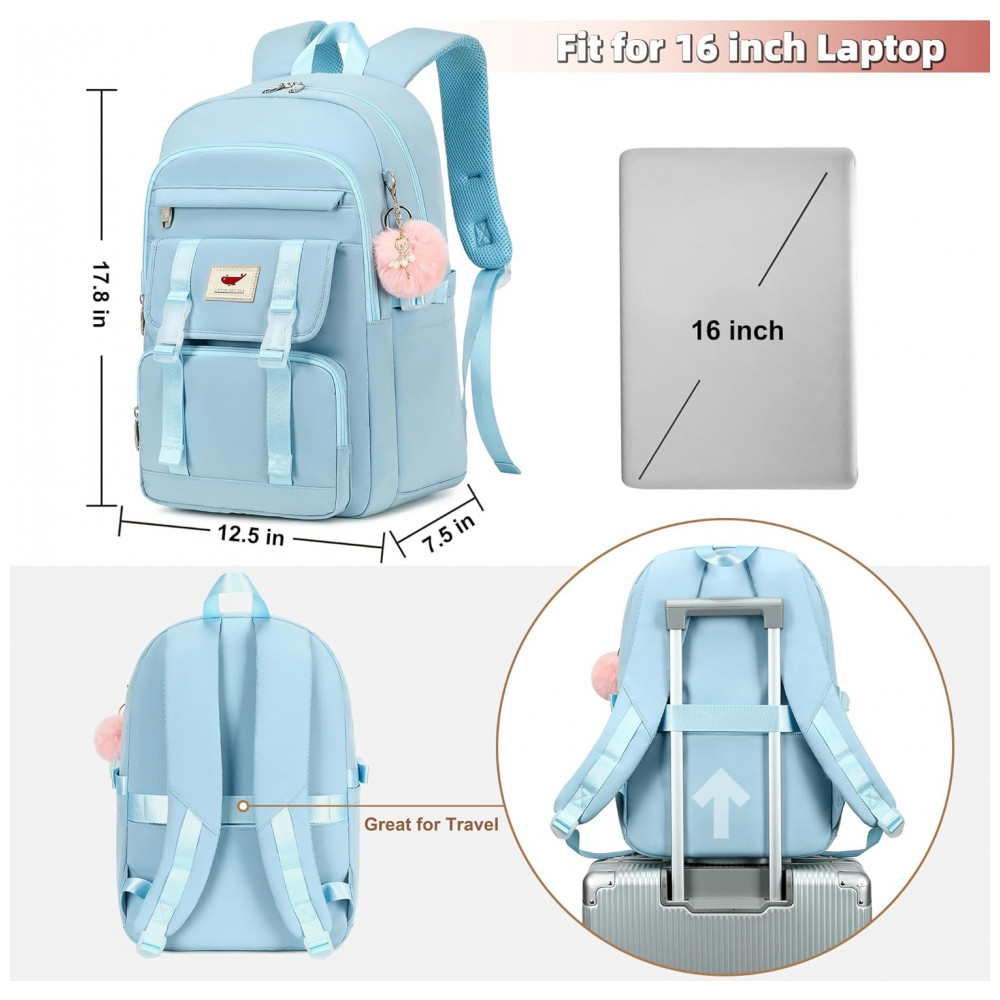 Conjunto 3 em 1 composto por mochila principal, lancheira e estojo, indicado para adolescentes, estudantes e mulheres em rotinas de escola, faculdade, trabalho, viagens curtas e uso diário. A mochila comporta notebook de até 16 polegadas em compartimento acolchoado, além de cadernos, livros, tablet, estojo, carregadores e itens pessoais distribuídos em múltiplos bolsos internos e externos.