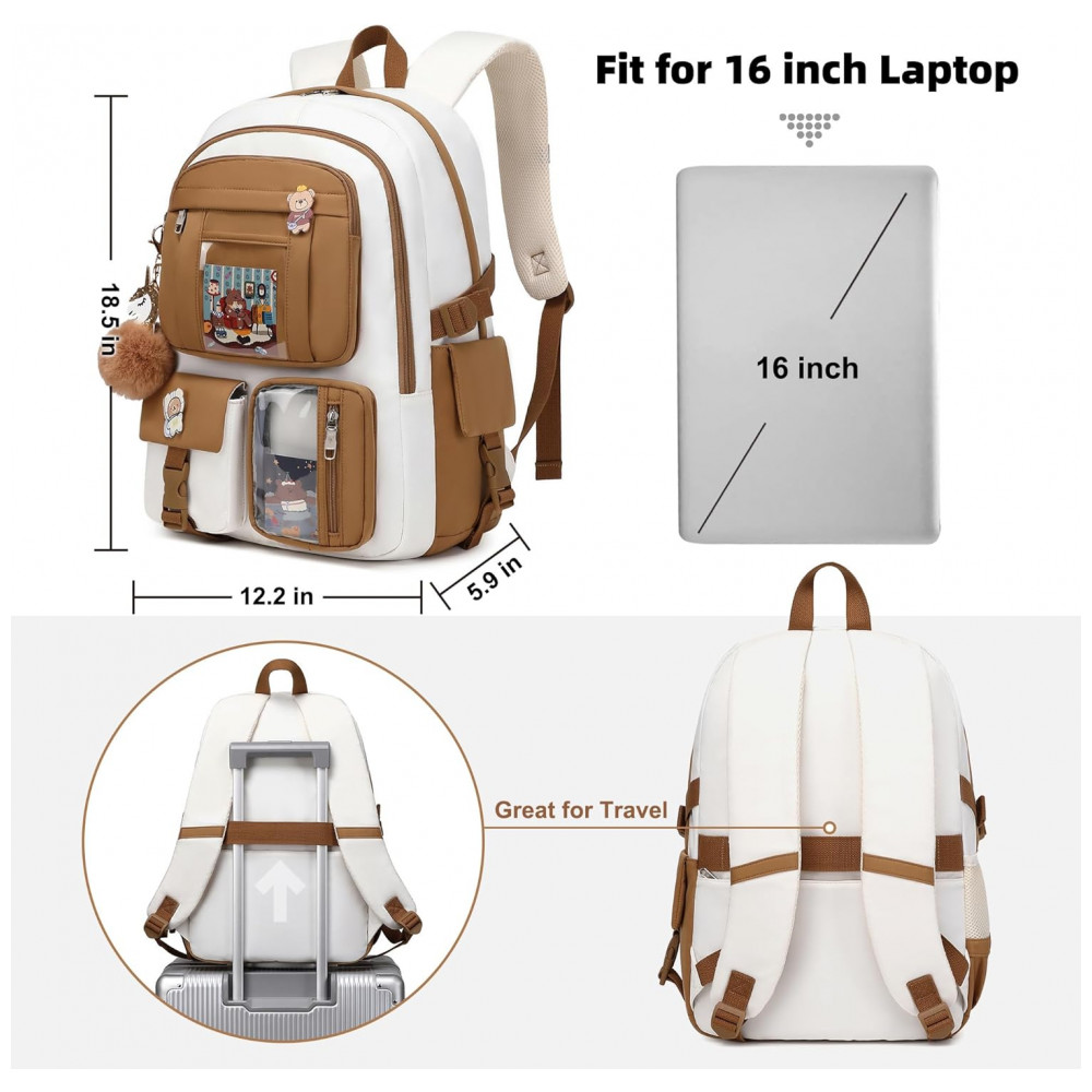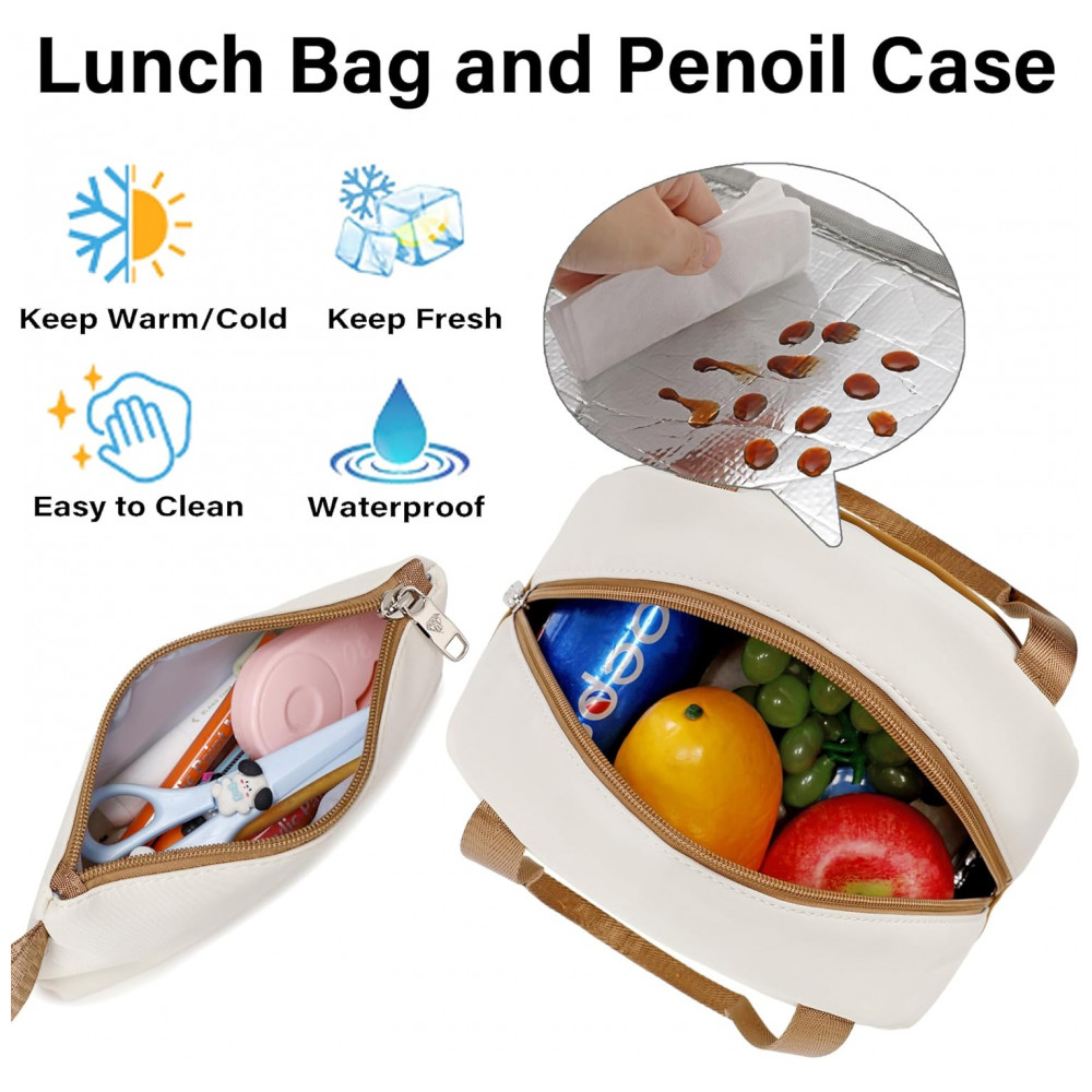 Conjunto 3 em 1 composto por mochila principal, lancheira e estojo, indicado para adolescentes, estudantes universitárias e mulheres em rotinas de estudo, trabalho e viagens curtas. A mochila comporta notebook de até 16 polegadas em compartimento acolchoado, além de cadernos, livros, tablet, carregadores, acessórios pessoais e itens de uso diário, distribuídos em múltiplos bolsos frontais, laterais e internos.