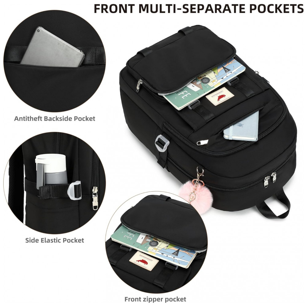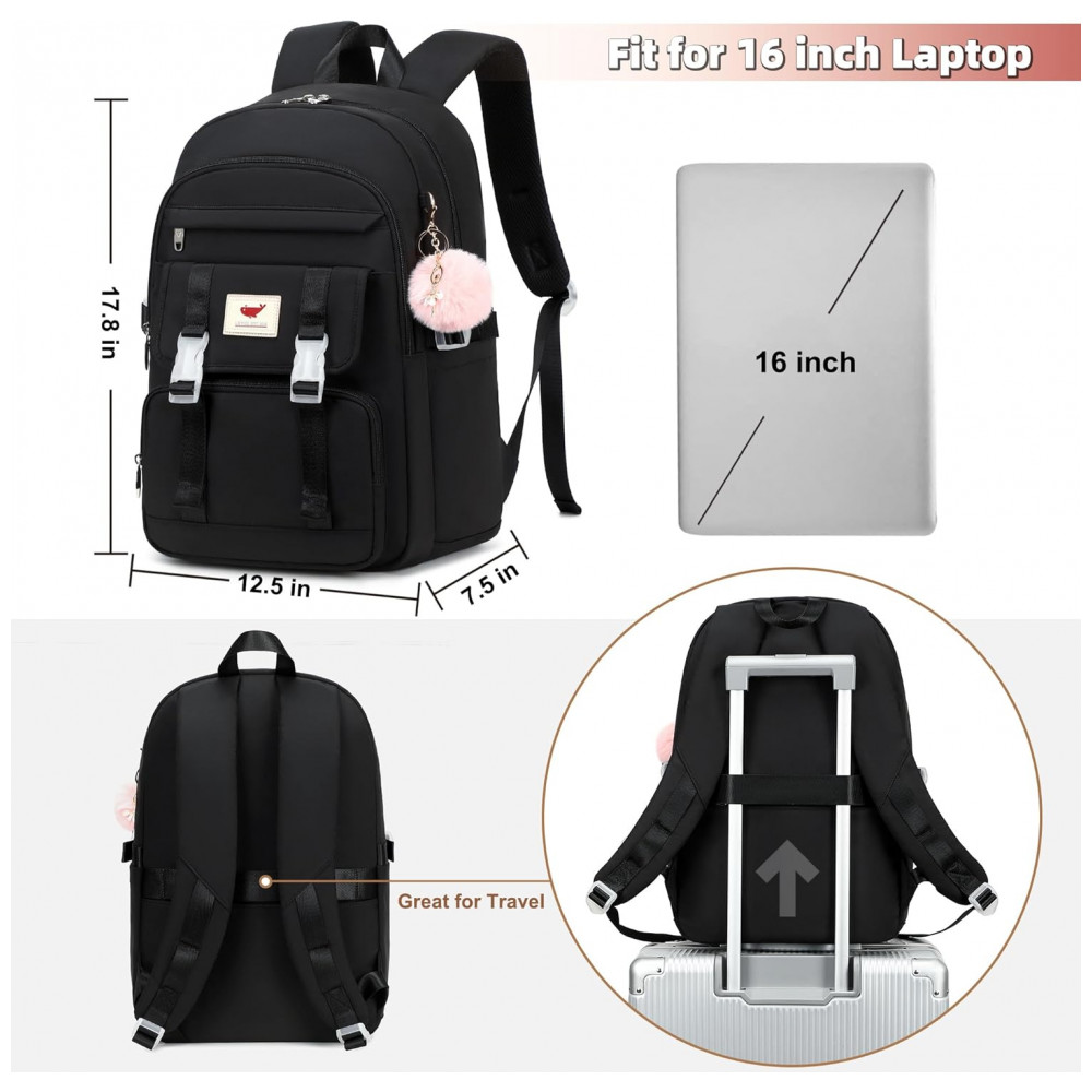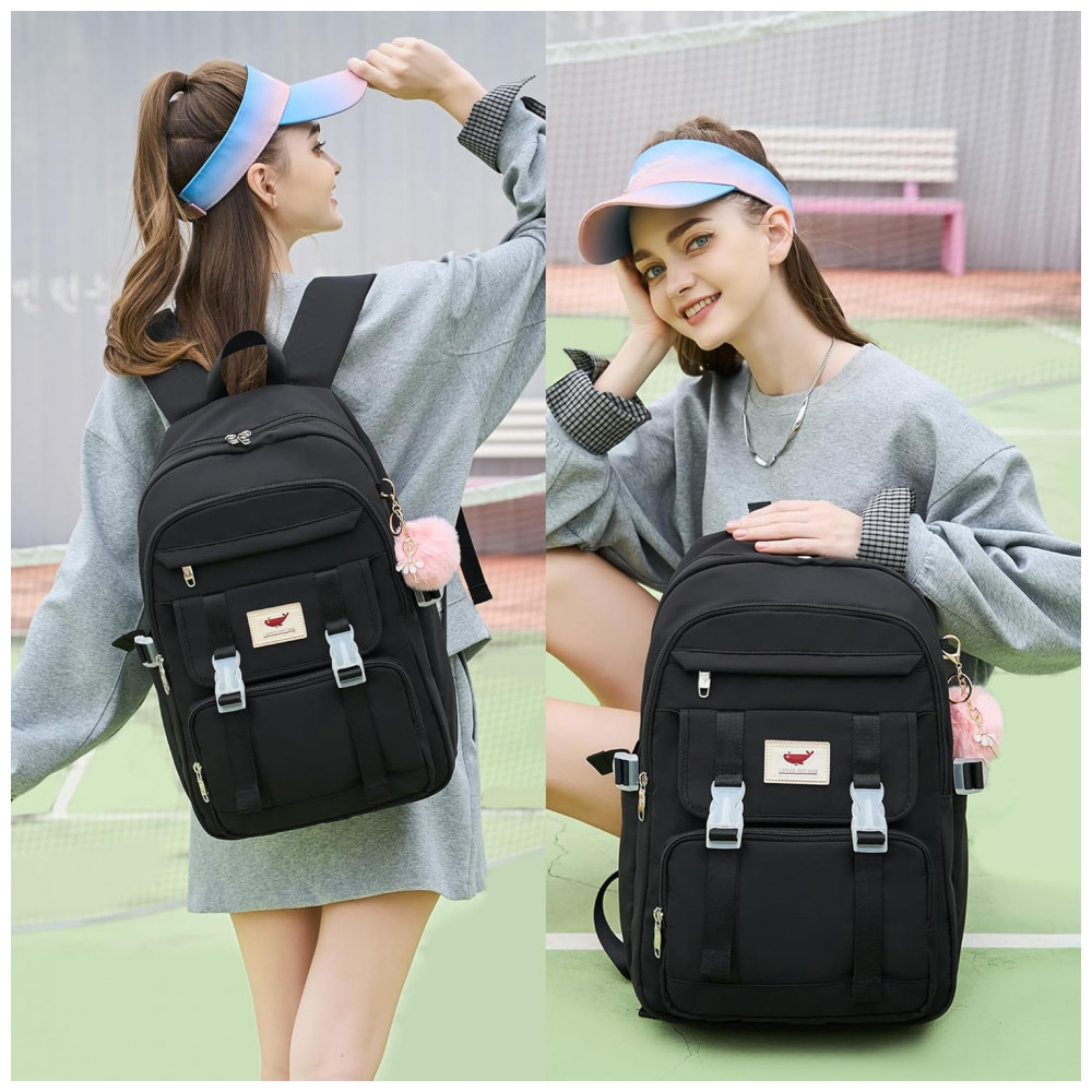 Conjunto 3 em 1 composto por mochila principal, lancheira e estojo, indicado para adolescentes, estudantes e mulheres em rotinas de estudo, trabalho, viagens curtas e uso diário. A mochila comporta notebook de até 16 polegadas em compartimento acolchoado, além de cadernos, livros, tablet, estojo, carregadores e itens pessoais distribuídos em múltiplos bolsos internos e externos.