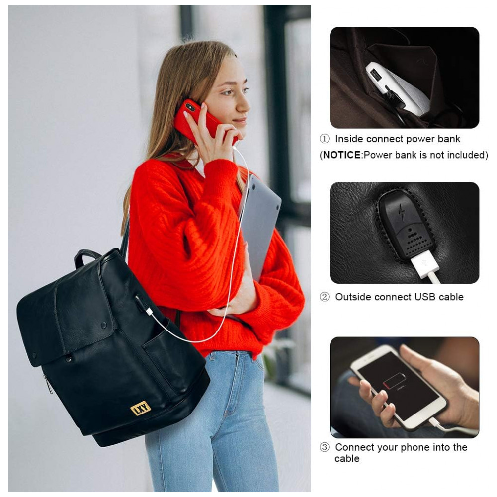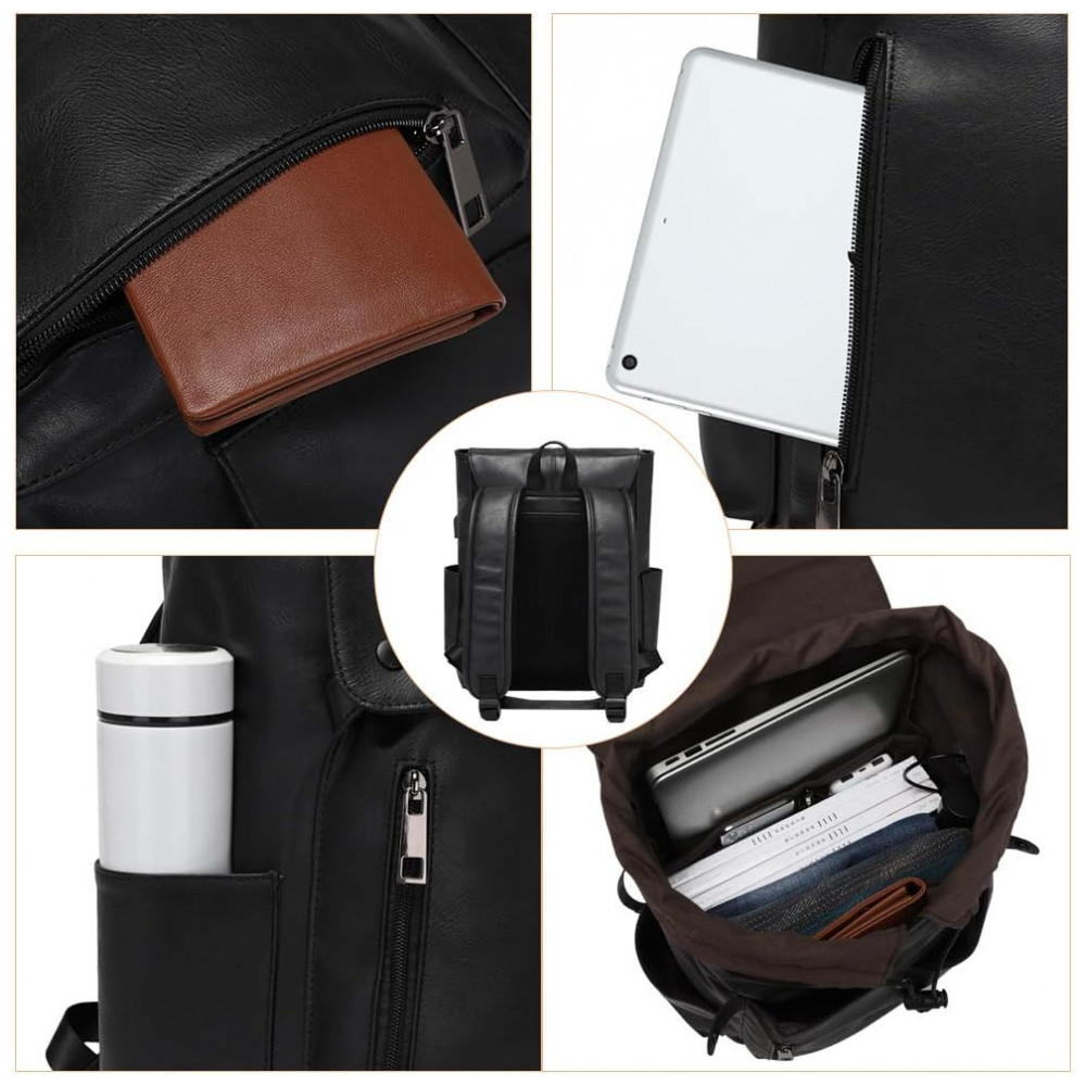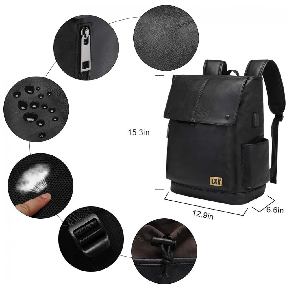 Mochila Unissex de Couro Sintético para Laptop e Porta Carregamento USB LXY Preta