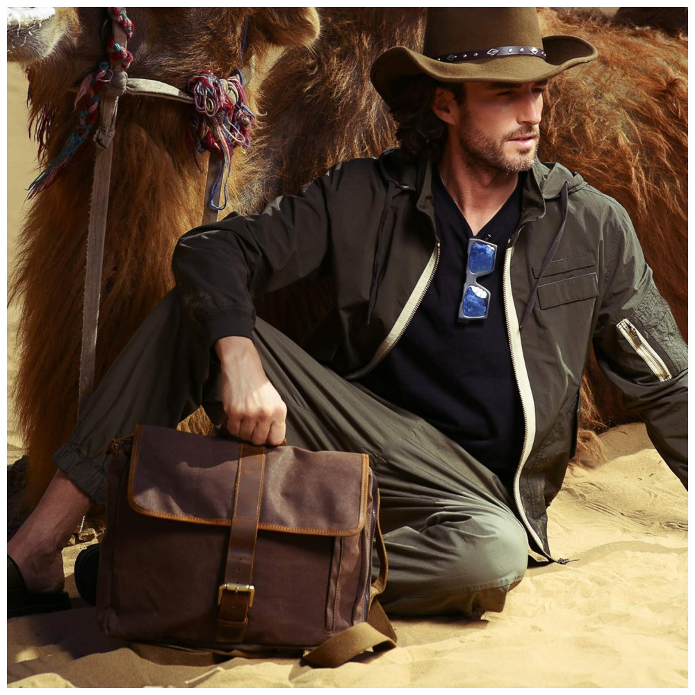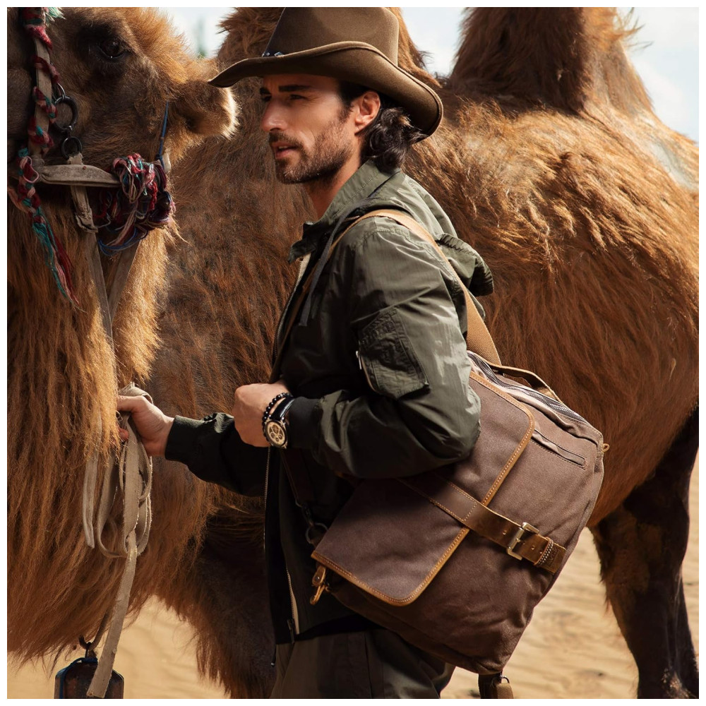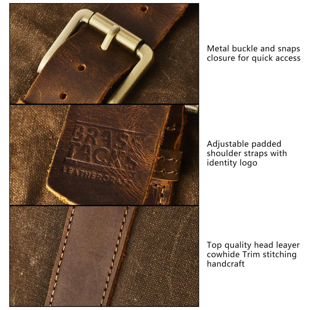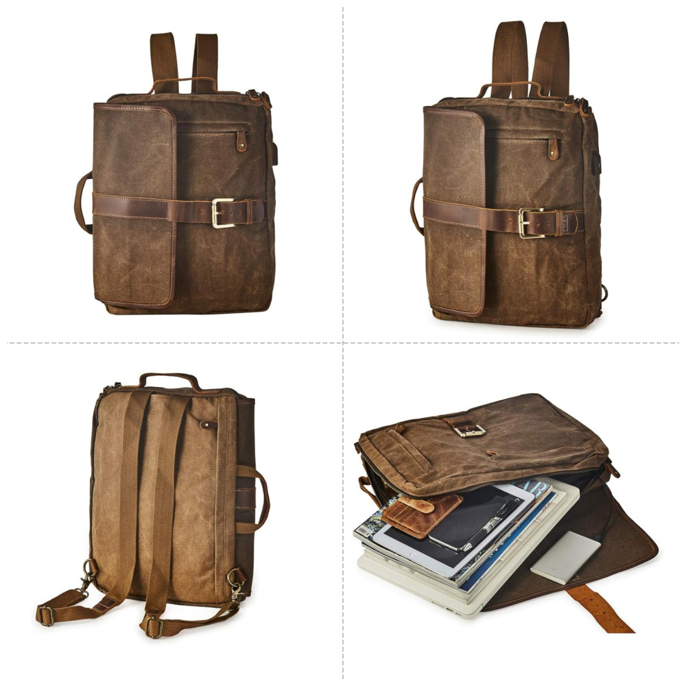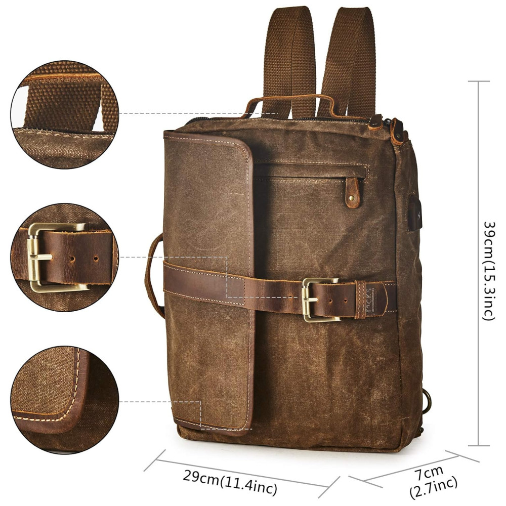 Mochila Vintage de Couro e Lona Encerada Impermeável para Laptop Unissex