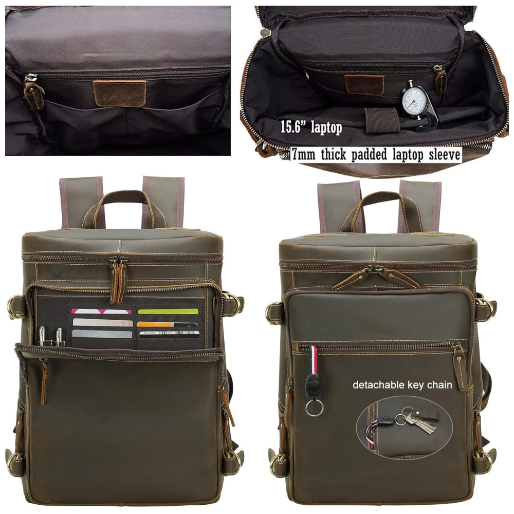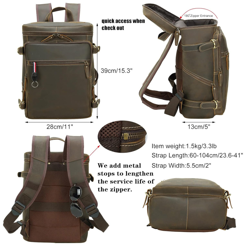 Versão de atualização Com base no comentário do cliente, a mochila de couro vintage foi atualizada para zíperes YKK, que podem suportar testes de força de tração 1000 vezes, bastante duráveis. A parte traseira da mochila marrom é atualizada para espaçador de malha, respirável e confortável, além de evitar manchas na roupa. O cinto antiderrapante para alças de ombro mantém o equilíbrio do peso para aliviar a fadiga da carga. Um cinto de bagagem para colocar esta mochila de viagem na mala para facilitar sua viagem. Um chaveiro , cordão é adicionado.