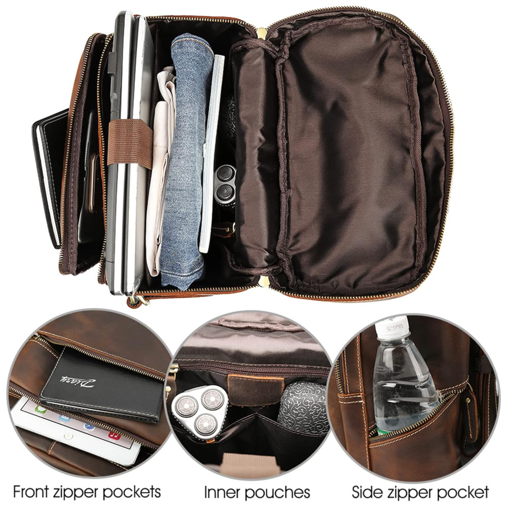 Couro de vaca A mochila de couro para homens é feita de couro de cavalo maluco espesso, cuja superfície tem um aspecto retro áspero, durável e resistente. A característica desse tipo de couro é que ele fica cada vez mais brilhante com o tempo. É por isso que muitas pessoas se tornam seguidores da bolsa de couro de cavalo louco.