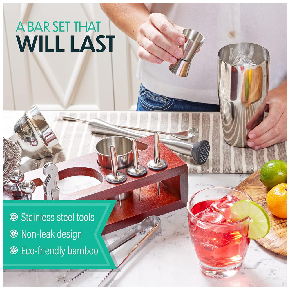 Conjunto completo atualize seu happy hour com nosso conjunto de coquetéis de 24 peças que inclui um shaker de licor, jigger, colher de mistura, muddler, pinças de gelo, filtro, suporte de madeira, bolsa de transporte de veludo e muito mais