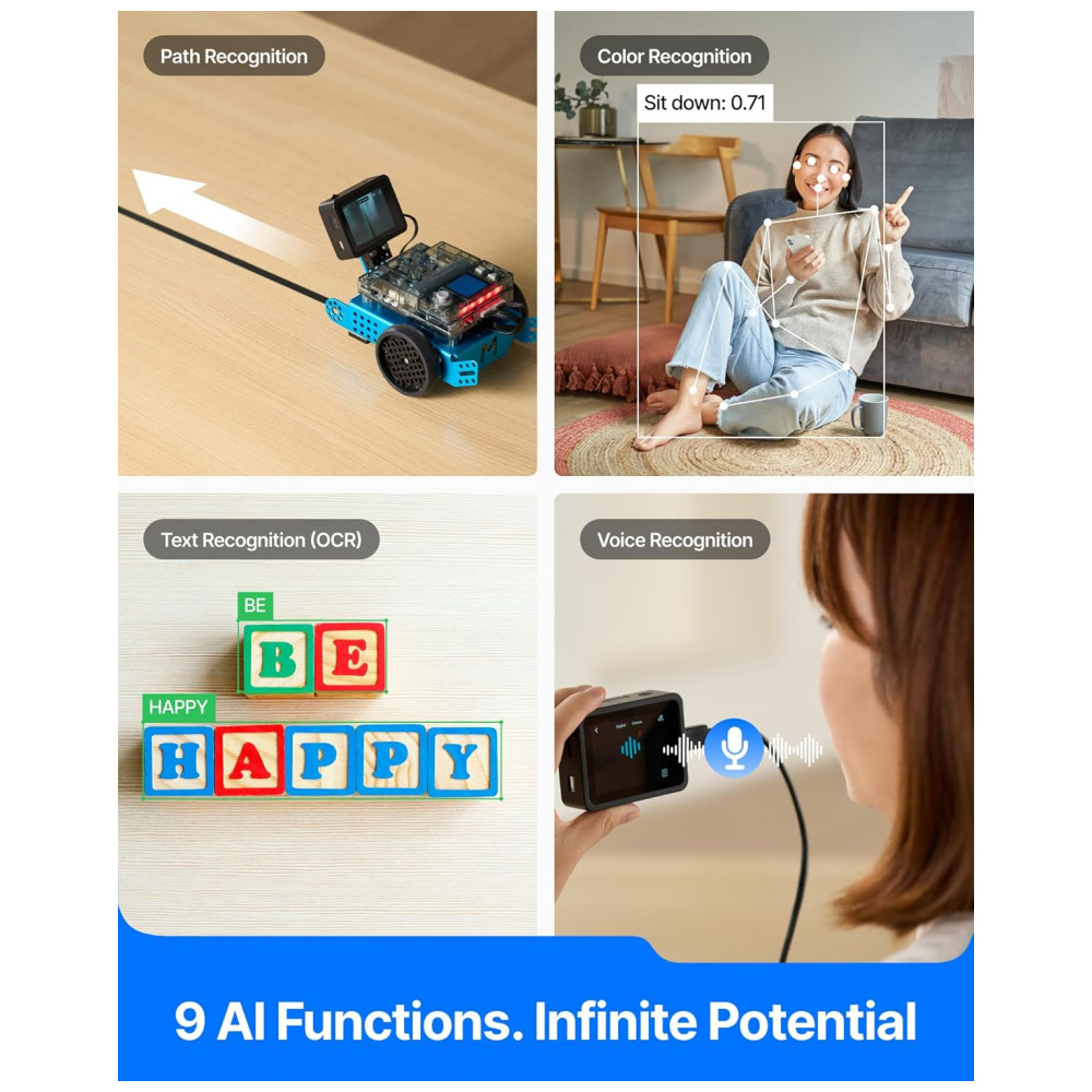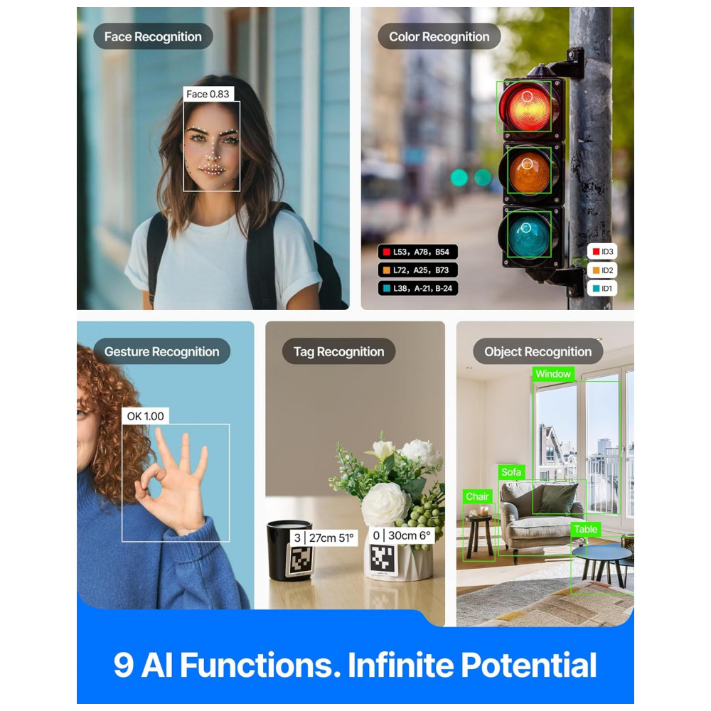 O AI Camera 2.0 é um módulo de visão artificial “all‑in‑one” voltado para educação, com sistema Linux embarcado e processador ARM dedicado à execução local de modelos de IA. Ele traz 9 modelos prontos para uso (reconhecimento de rosto, cor, gestos, tags, objetos, trajetórias, postura, texto e voz), permitindo usar IA sem configuração complexa, em projetos com mBot2, CyberPi e módulos mBuild.