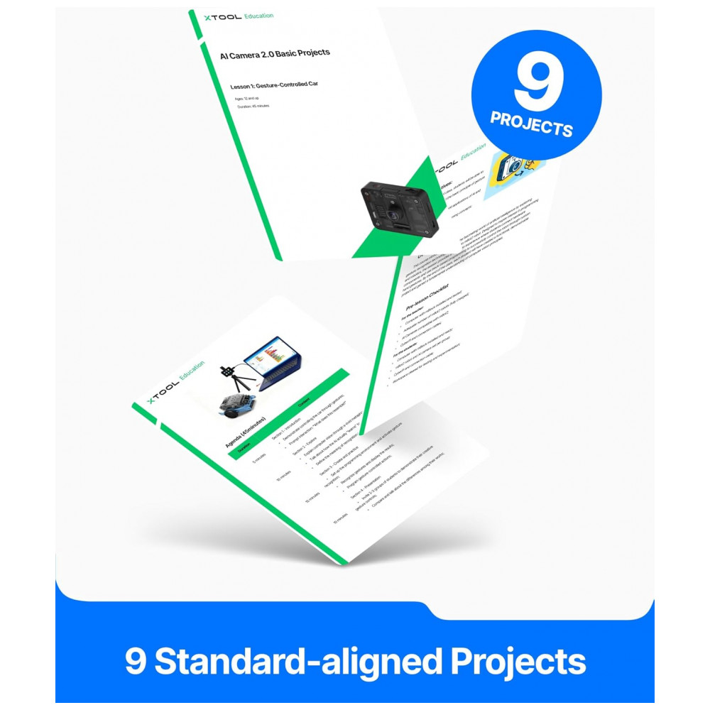 Conteúdo educacional: 21 projetos alinhados a currículo (como “Gesture Wizard” e estacionamento inteligente) e recursos adicionais de curso básico AI Camera 2.0 para uso em sala de aula