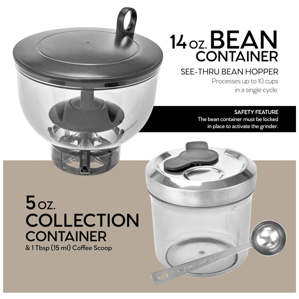 FAZ 2 A 10 Xícaras DE UMA VEZ Processe qualquer quantidade de 2 a 10 xícaras em um único ciclo O contêiner de feijão transparente contém 414 mL de grãos e o recipiente de café moído apertado tem capacidade para 147 mL de café Desfrute de um grão consistente sem necessidade de nitidez