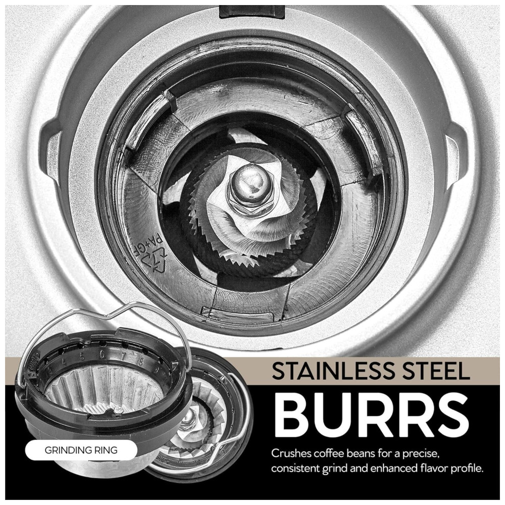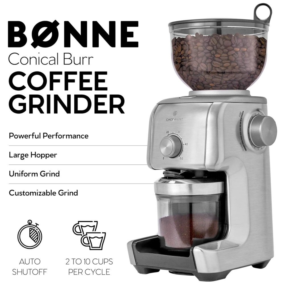 MOAGEM DE ALTA PRECISÃO O moedor de café Bonne utiliza rebarbas de aço cônicas de nível que trituram os grãos de café em vez de cortá los com uma lâmina tradicional Este projeto de corte avançado oferece uma moagem precisa e consistente e um sabor aprimorado