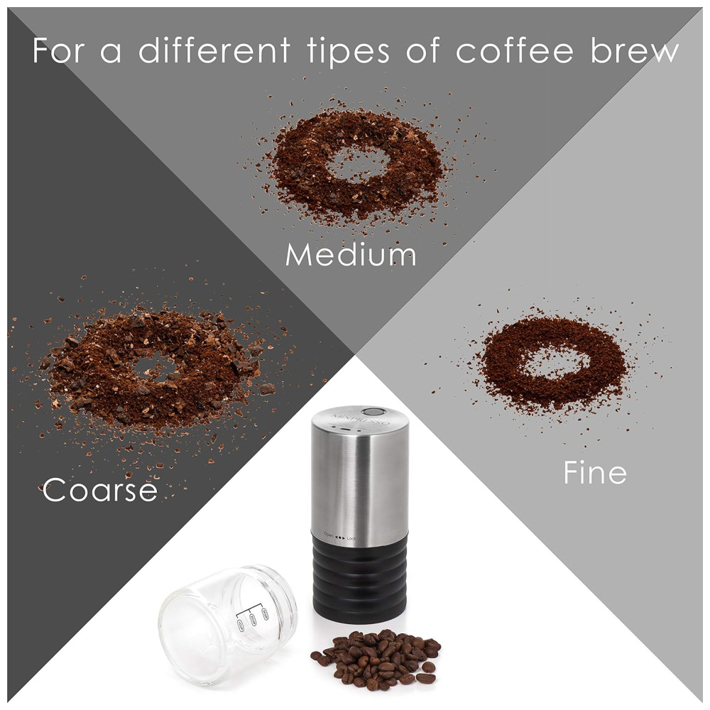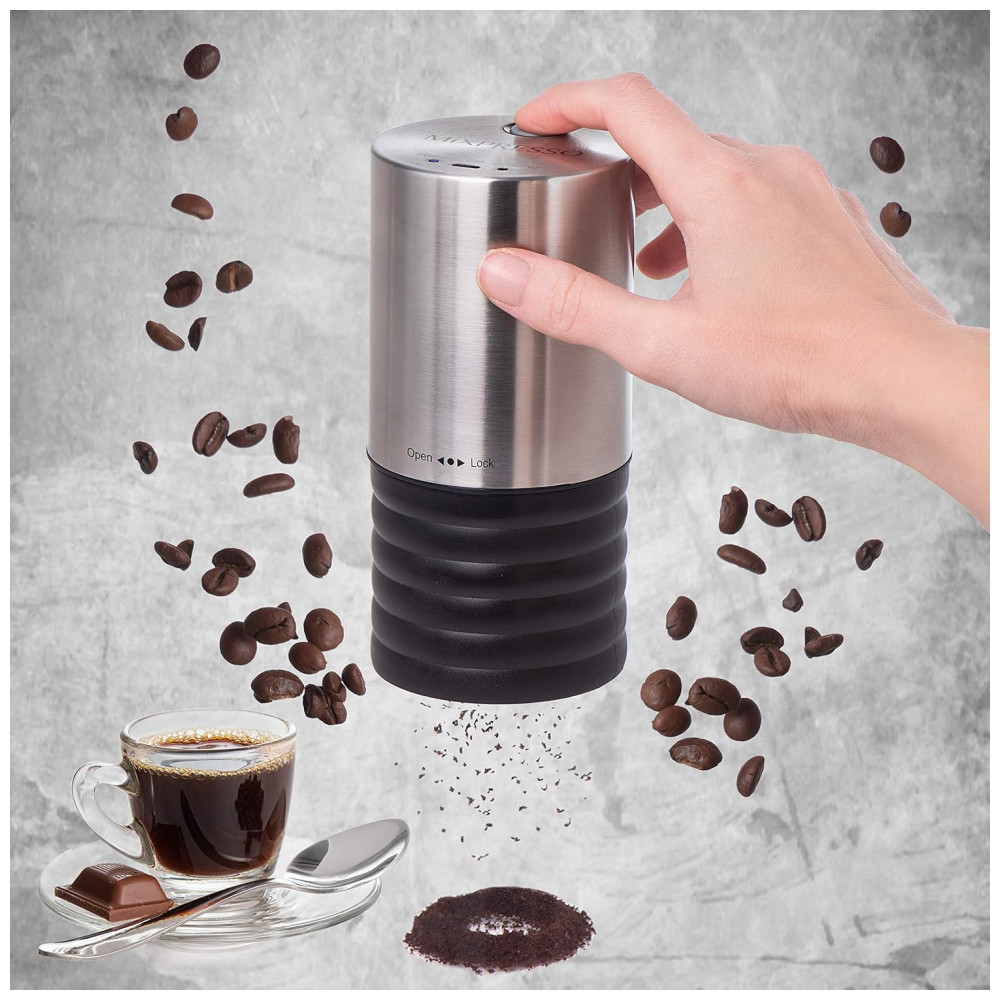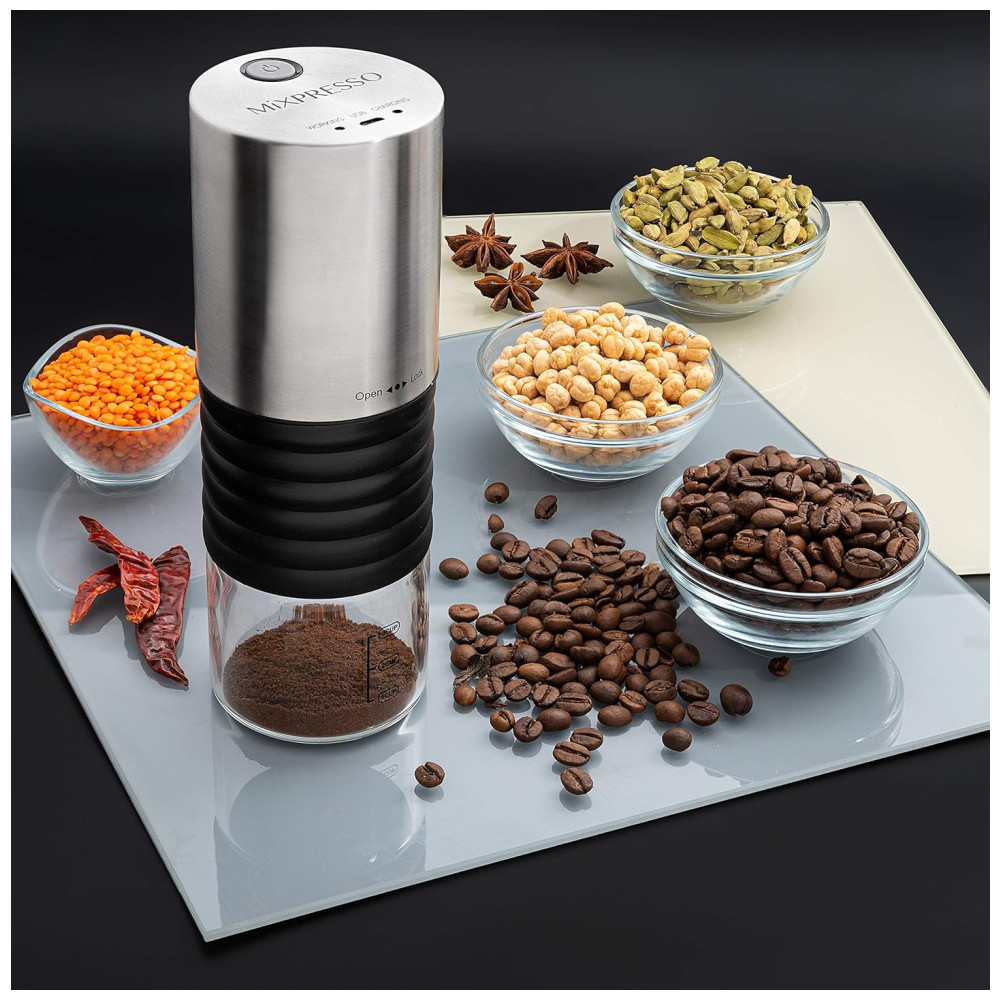 O MOINHO DE CAFÉ INDIVIDUAL Nós da Mixpresso queremos oferecer a você o ajuste perfeito para suas necessidades, então com nosso moedor elétrico com um simples toque de um botão você pode ter um café fresco e aromático, com vários níveis de moagem em nosso moedor de grãos de café electric oferece uma grande variedade de bebidas de café, desde o tradicional expresso, mocha, café frio, prensa francesa e muito mais, para abrir sua manhã com um rico e delicioso café de grãos de café frescos