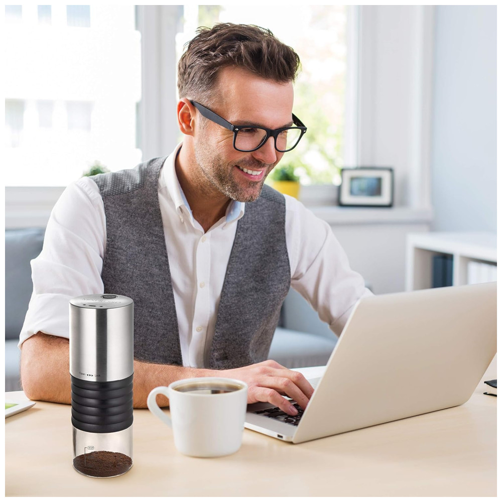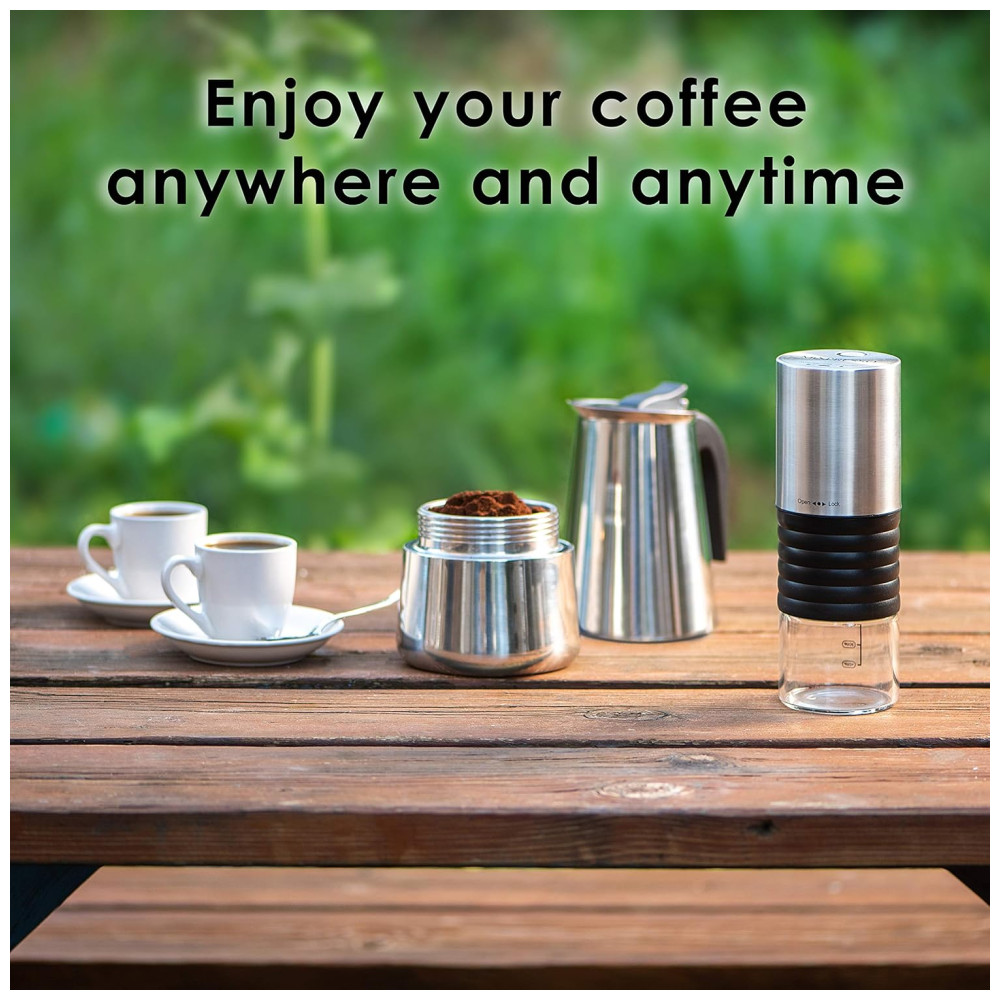 PEQUENO MOINHO DE CAFÉ COMPACTO Nosso moedor de café oferece a opção de conectar um USB e permitirá que você moa seus grãos de café em qualquer lugar e a qualquer hora, no escritório, acampando com amigos, no quintal enquanto viaja e tudo em um mini compacto e tamanho conveniente para zenamento e transporte