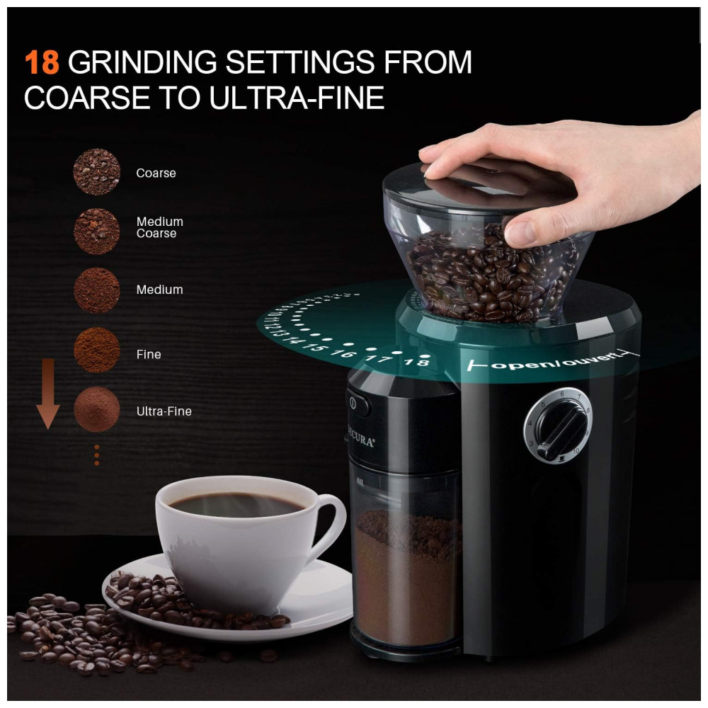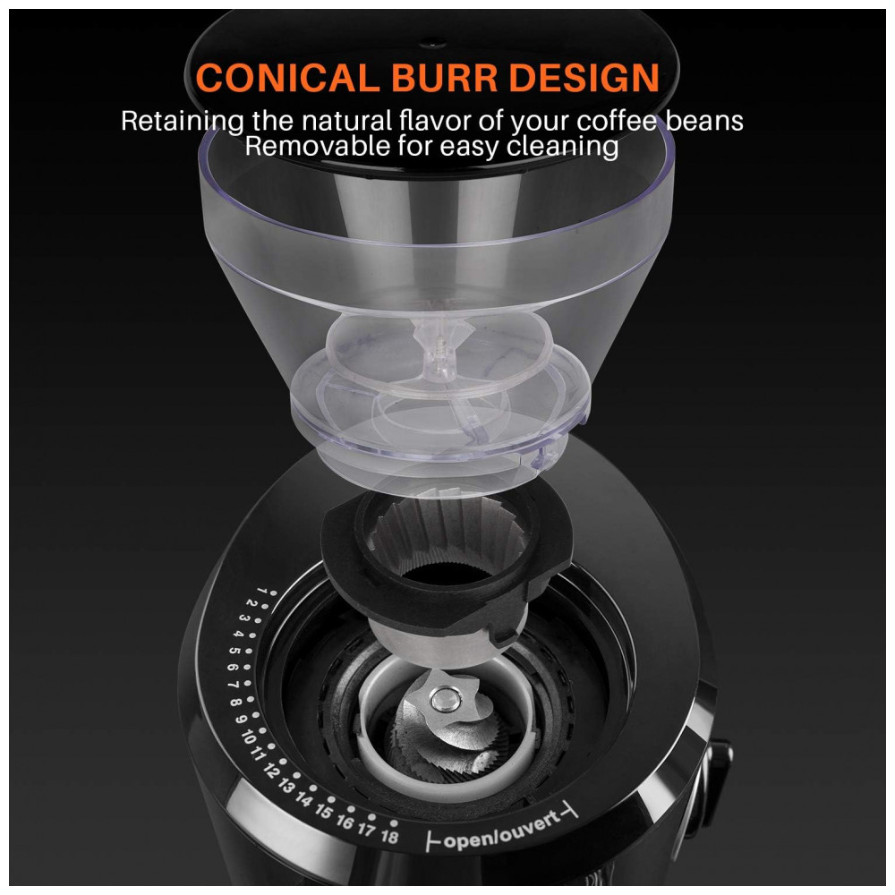 18 configurações de moagem Projetado com rebarbas cônicas de grau de que mói de ultrafino a grosso, perfeito para todos os tipos de métodos de preparo de café.