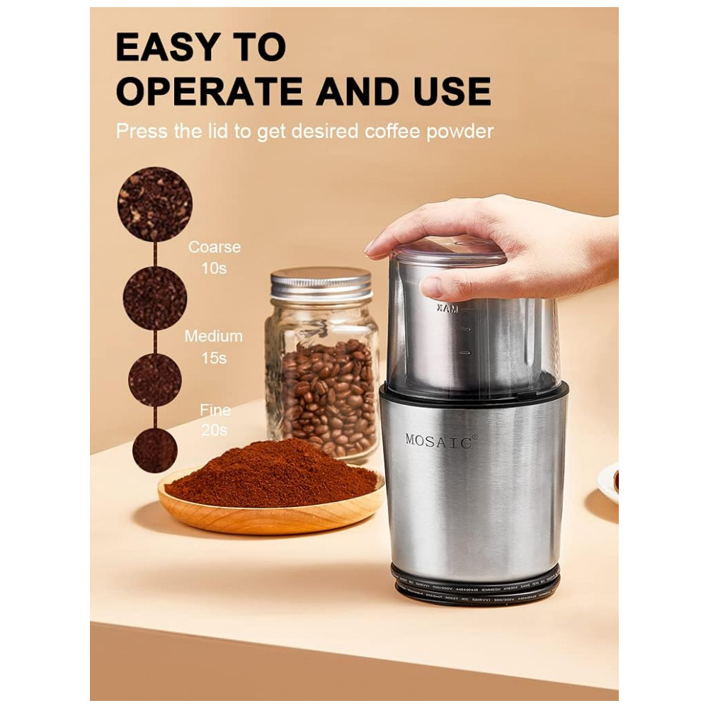 Poderoso e durável O potente motor MOSAIC de 300 W torna a moagem mais eficaz, as lâminas de longa duração moem facilmente qualquer tipo de café que você goste. 6 segundos para pó grosso, 10 segundos para pó médio e 15 segundos para pó fino.
