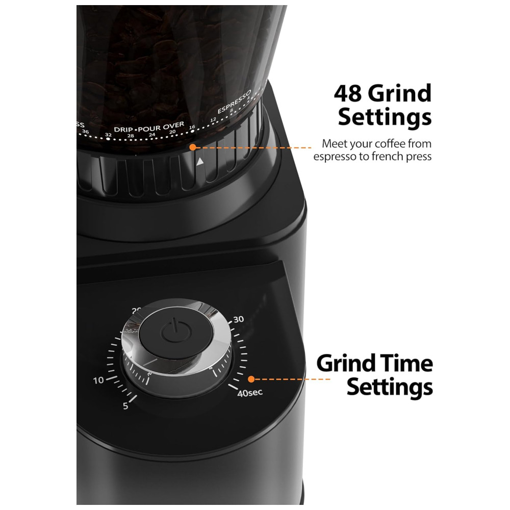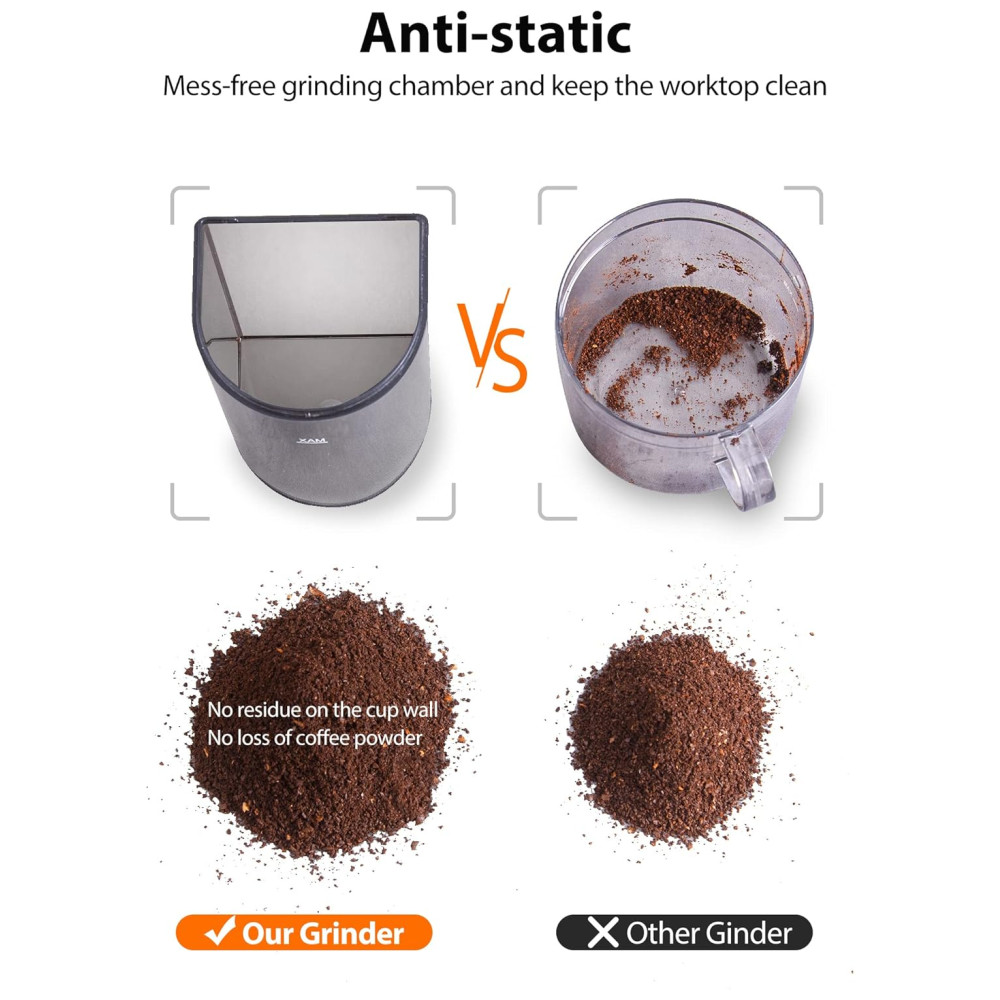 A tecnologia antiestática atualizada evita que os grãos de café voem e mantém seu espaço de trabalho limpo. O design marrom da caixa reduz o impacto dos raios ultravioleta nos grãos de café. O moedor de grãos de café vem com uma escova embutida para evitar bloqueio e uma rebarba removível para facilitar a limpeza. Lembre se de manter a rebarba cônica seca antes de remontar para evitar curto circuito. A cafeteira rebarba requer uma voltagem de 120 V, 60 Hz.
