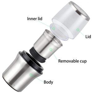 Moedor de Especiarias Elétrico Com escova para facilitar a limpeza Tampa com janela de visualização Lâmina, copo e carcaça em aço inox SUS304, sem ferrugem copo destacável, sem lavagem Copo e tampa adequados para lavagem Pés antiderrapantes para uso Com zenamento de cabo