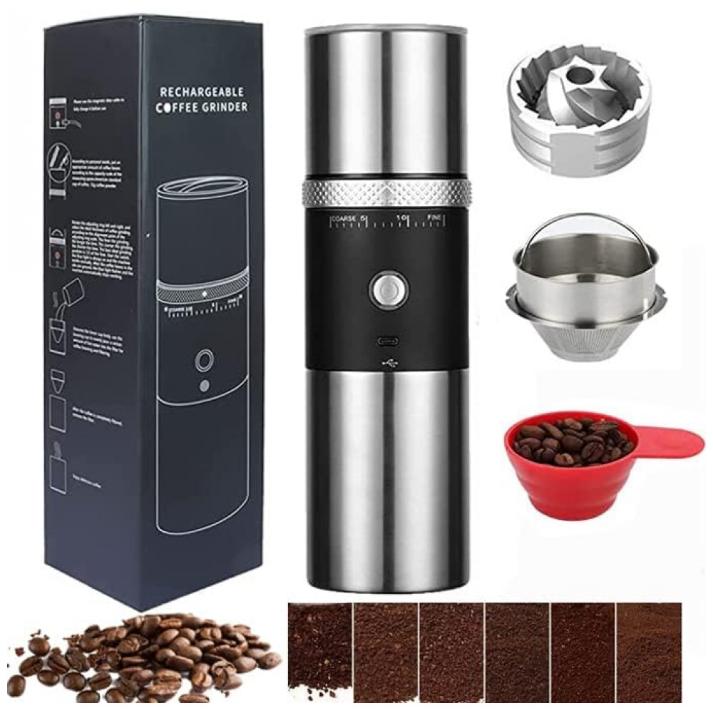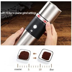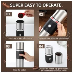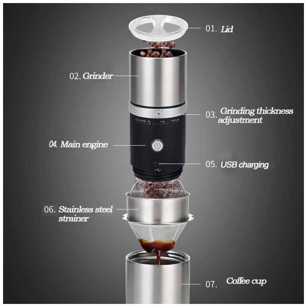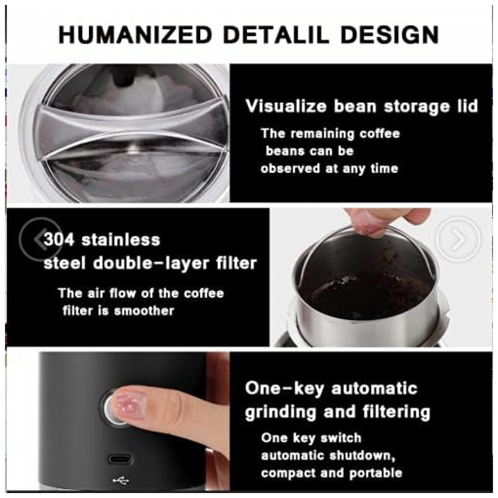 Moagem e filtragem automáticas Interruptor de um botão, desligamento automático de 3 minutos, tamanho mini e portátil. O moedor de grãos de café com carregamento Micro USB, é compatível com qualquer dispositivo de energia com porta USB. Coloque este mini moedor de café recarregável sem fio e USB em sua bolsa ou mala, você pode desfrutar de café moído na hora a qualquer hora, em qualquer lugar, seja em casa, no trabalho, em viagens, caminhadas ou acampamentos…