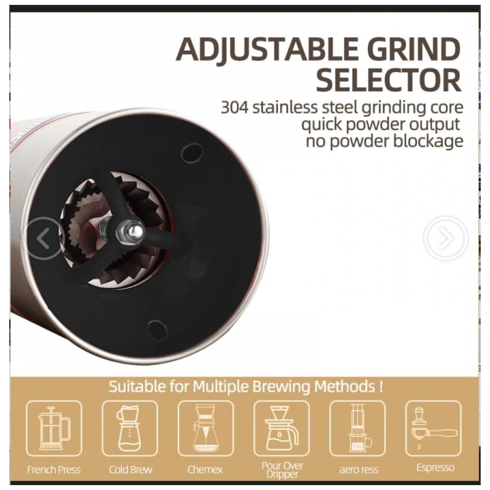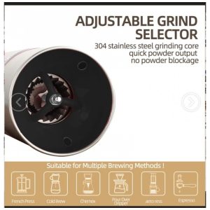 15 configurações de moagem O moedor de café cônico portátil elétrico com chip inteligente pode reconhecer de forma adaptativa a resistência à moagem, o que o torna mais conveniente para evitar travamento e parada. Com 15 níveis de ajuste de espessura, uma variedade de sabores para atender aos seus diferentes métodos de extração. O moedor de café cônico portátil com várias configurações de moagem para moer seus grãos de café para qualquer método de preparo desejado, do expresso à prensa francesa, do ultrafino para extra grosso.