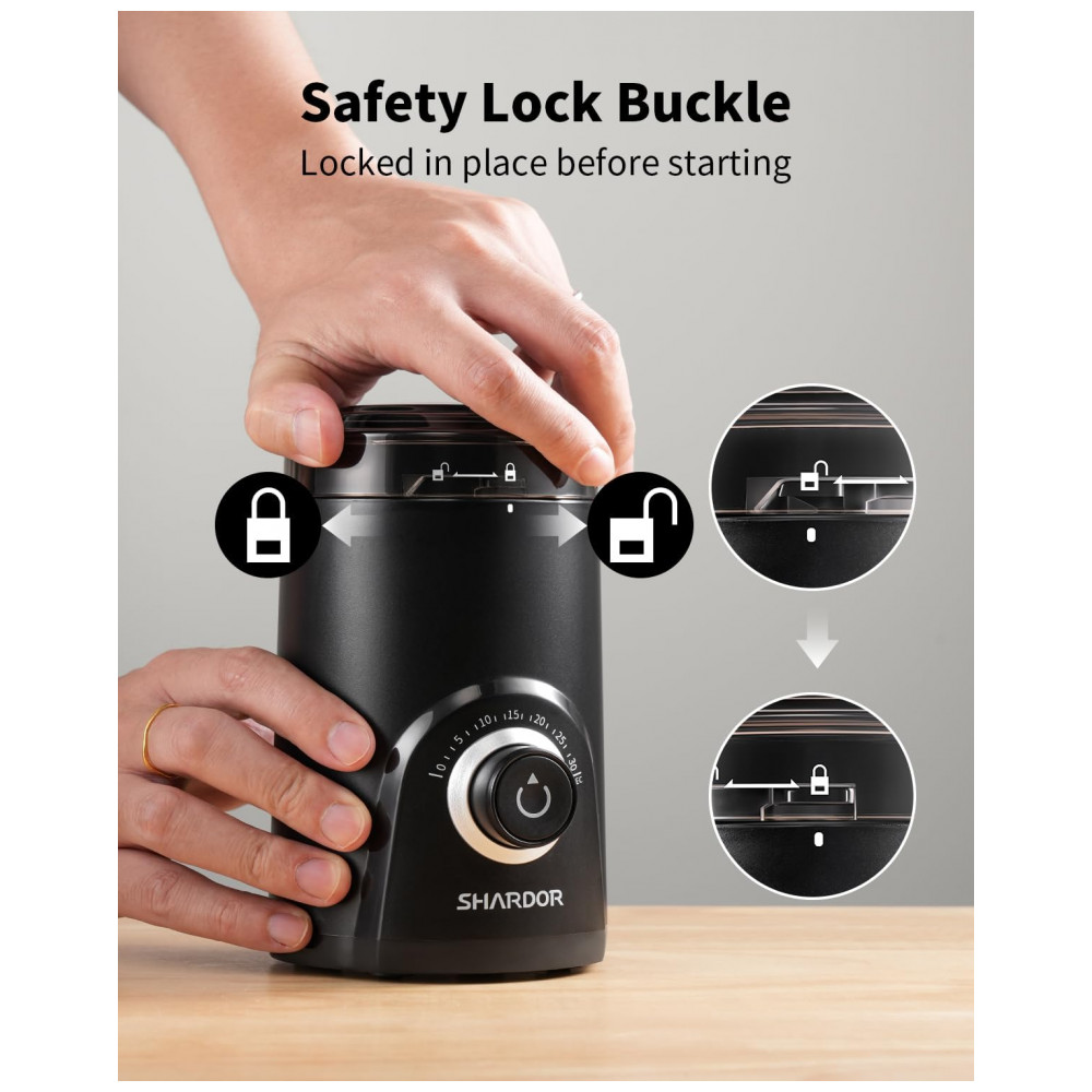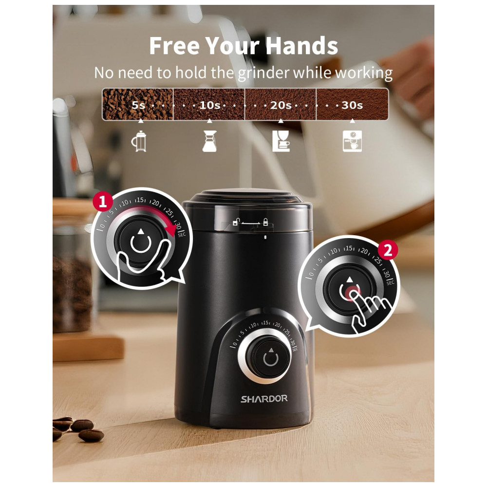 O moedor de café elétrico SHARDOR super silencioso foi projetado para moer grãos de café, especiarias, ervas secas e grãos em uso doméstico, com controle de moagem por tempo. O ajuste é feito por botão giratório com marcações de segundos, permitindo selecionar o tempo de operação para obter desde moagem mais grossa até pó fino conforme a necessidade.