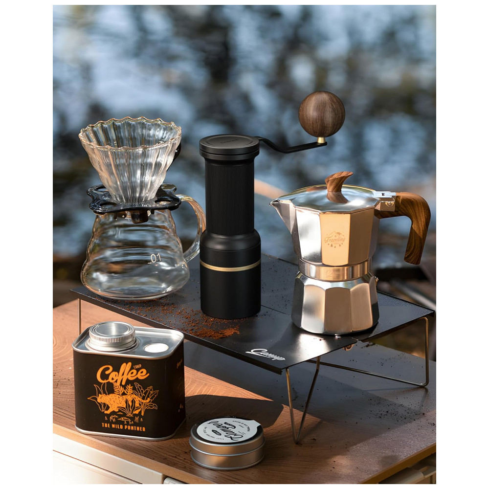 A construção em alumínio integra área de pegada com grip antiderrapante para maior estabilidade na operação manual. O sistema magnético de acoplamento entre a câmara de moagem e o reservatório de pó reduz a retenção de resíduos, facilitando a queda direta do café moído e contribuindo para limpeza mais rápida. O formato portátil é adequado para uso em casa e em viagens, acompanhado de estojo de transporte para proteção do equipamento em deslocamentos.