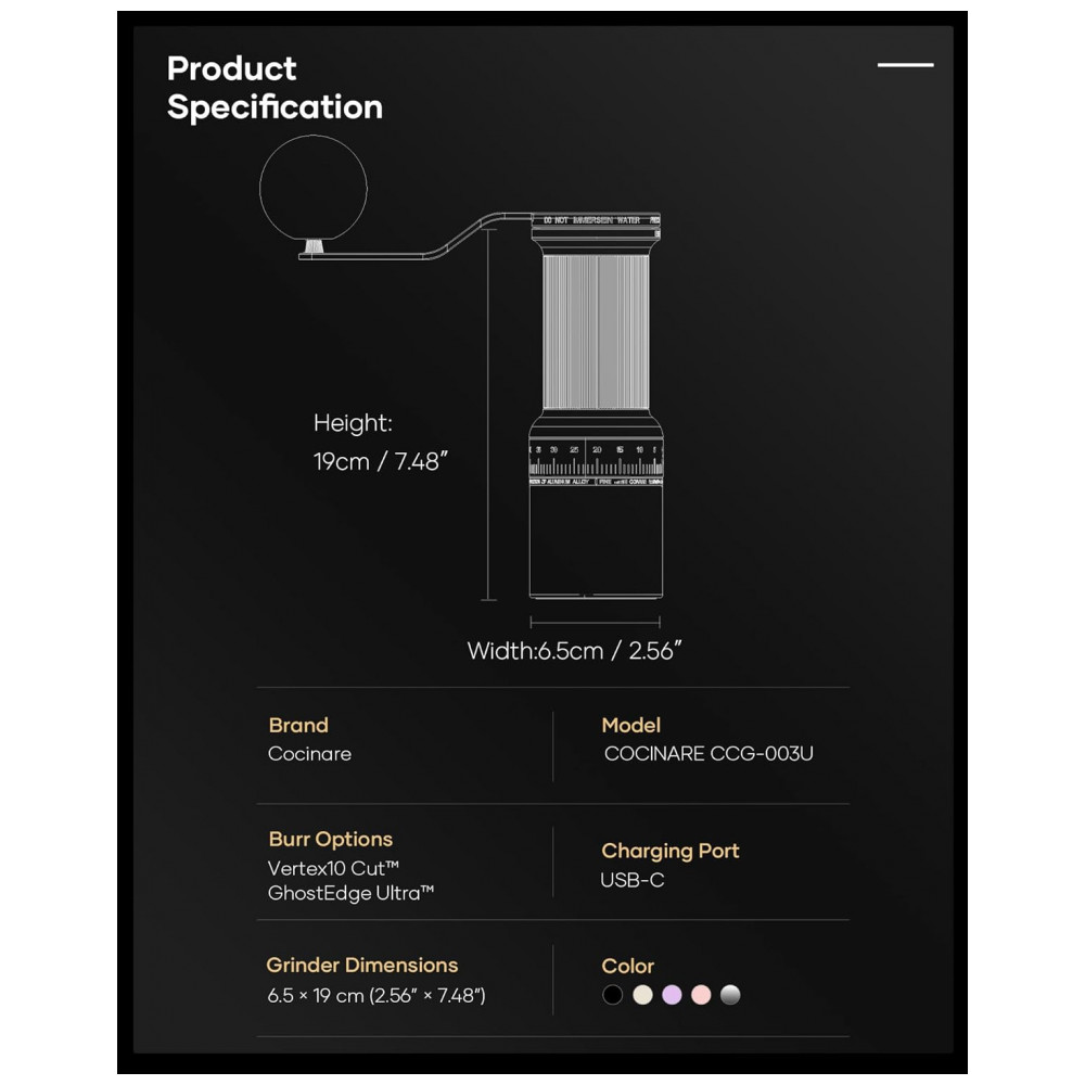 O moedor de café manual Cocinare ESSENCE GO B38 Ultra foi projetado para moagem precisa de até 30 g de grãos por ciclo, em um corpo compacto de alumínio com acabamento branco vintage. O conjunto de lâminas GhostEdge Ultra utiliza burrs com micro-serrilhas para padronizar o tamanho das partículas, oferecendo consistência em diferentes métodos de preparo como espresso, pour-over, prensa francesa, cold brew, moka e filtro elétrico. O ajuste externo com 80 cliques permite selecionar graus de moagem que vão de extra fino a grosso, favorecendo controle detalhado sobre o perfil de extração.