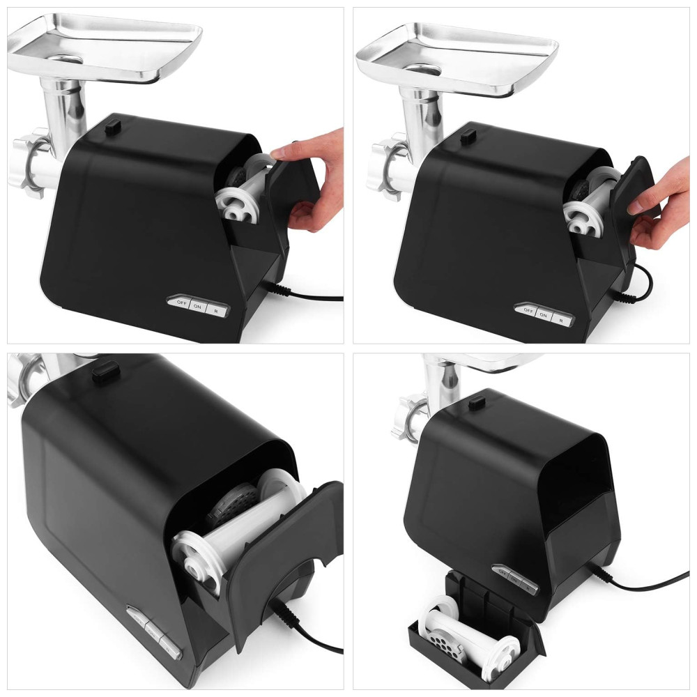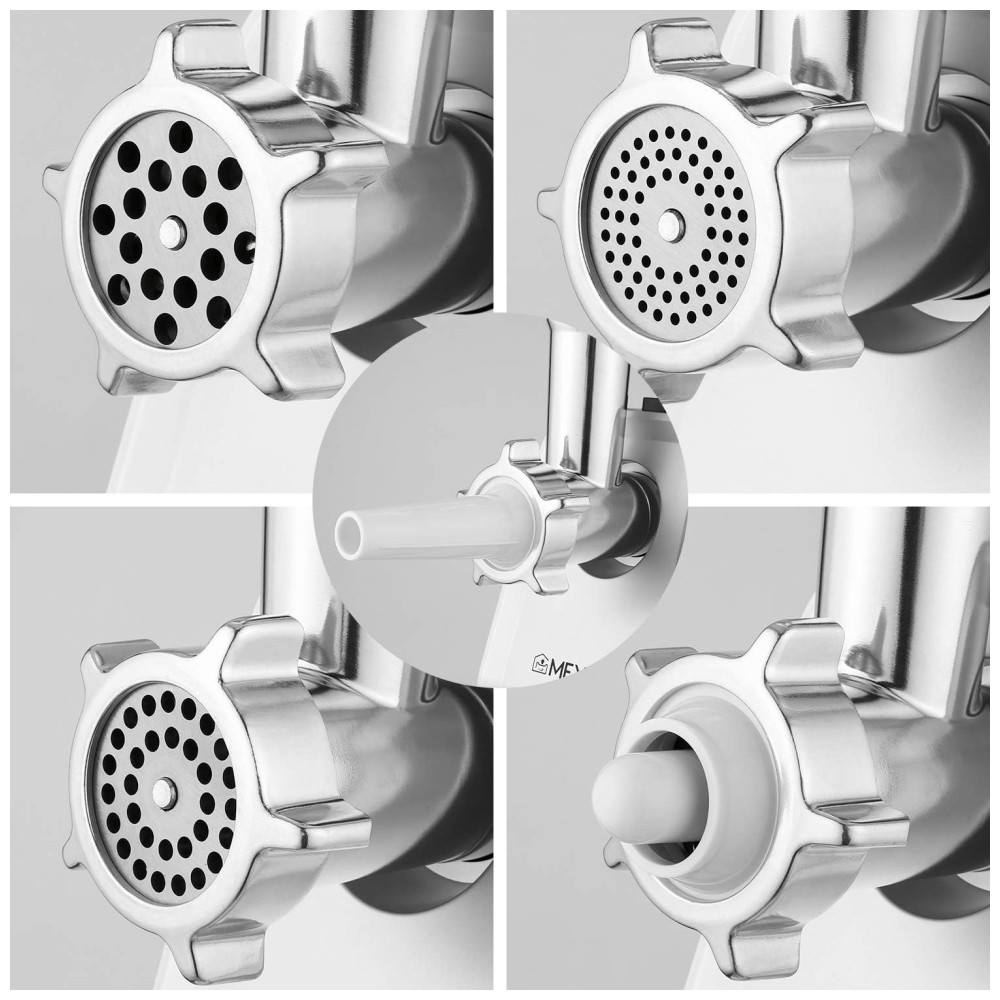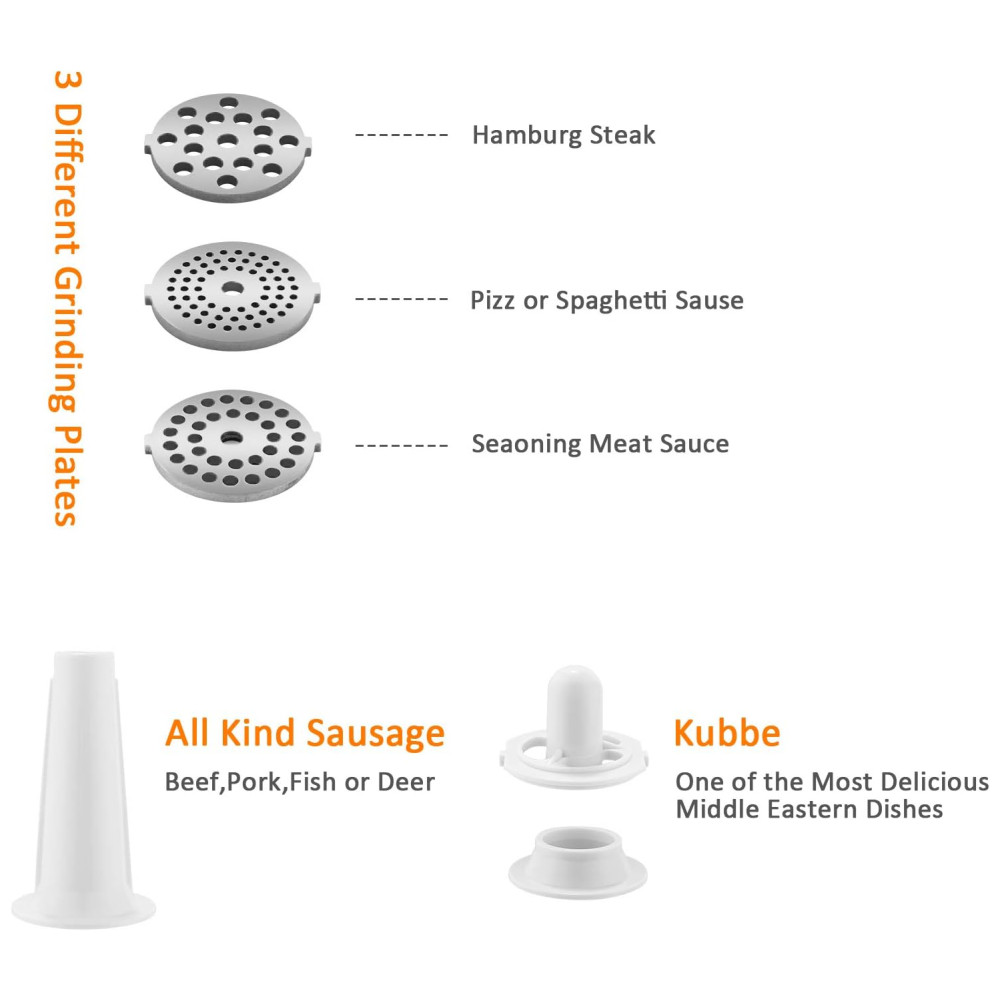Multi funções 3 placas de corte diferentes para moagem de carne grossa, média e fina. Não só pode ser para carne, mas também peixe, grama de trigo, pimenta, agárico, etc. 1 acessório para salsichas, 1 lâmina de corte, 1 empurrador de alimentos, 1 acessório kubbe. Excelente conjunto para moedor de carne. Material de alta qualidade Feito de aço inoxidável de qualidade alimentar, sistema avançado de proteção do motor de cobre, melhora a moagem em uma condição durável e segura. Fácil de limpar não pode ser lavado na máquina de lavar louça. Sempre seque a unidade após a lavagem para uma vida útil mais longa. Como um moedor de carne para serviço pesado, passou na aprovação da ETL. Máquina segura para alimentos para preparar a mais deliciosa almôndega ou hambúrguer em casa ou na festa. Projeto especial 3 Moedores e Tubos para Recheio de Linguiças em caixa de acessórios, parte traseira da máquina. Operação simples apenas 3 botões, OFF significa desligar o dispositivo. ON inicia o dispositivo. R significa que o dispositivo é girado na direção oposta para facilitar a limpeza.