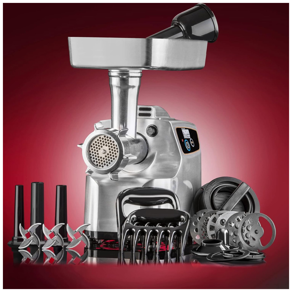O pacote completo de moagem doméstica STX Magnum 1800W Platinum Edition resfriado a ar patenteado apresenta um moedor elétrico de potência máxima de 1800 watts pesado e possui uma bandeja de carne de alta capacidade que facilmente comporta mais de 3 libras. de carne.