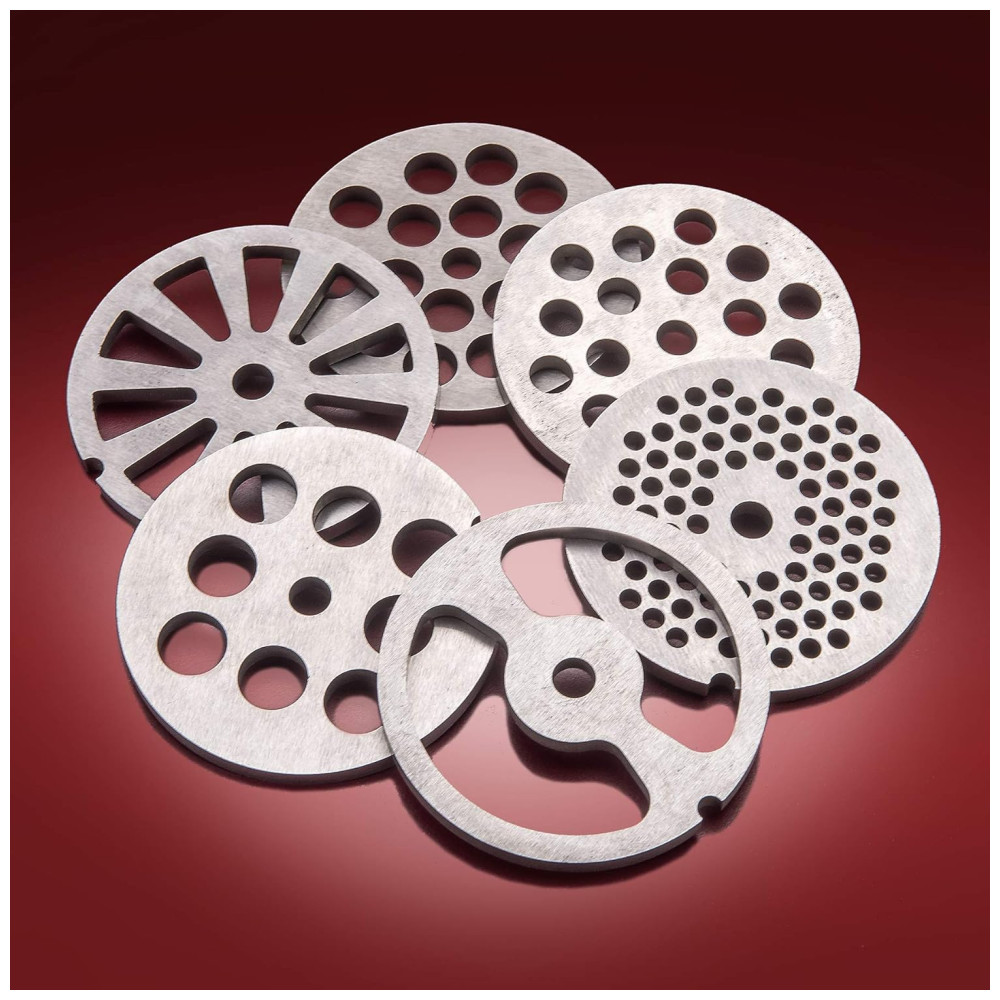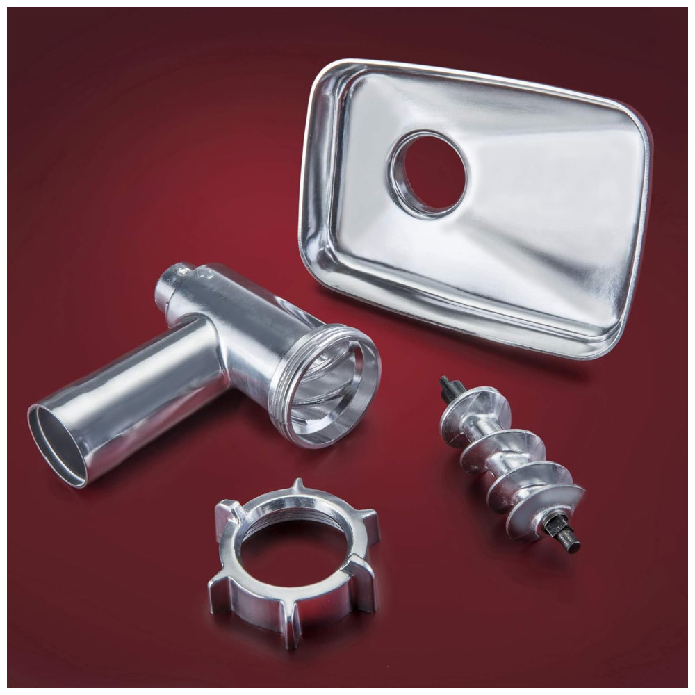 Este triturador Magnum 1800W Platinum Edition também inclui 1 cabeçote de trituração de alumínio polido e bandeja de carne de alta capacidade, 3 lâminas de corte de aço inoxidável de grau 304, 5 tamanhos de placas de moagem, 1 placa de recheio de salsicha, 3 tamanhos de salsicha Tubos de recheio, 1 Acessório para fazer Kubbe , Kibbe e 1 Empurrador , Stuffer de carne de palma fácil de usar, um par de garras de carne e prensa deslizante de hambúrguer
