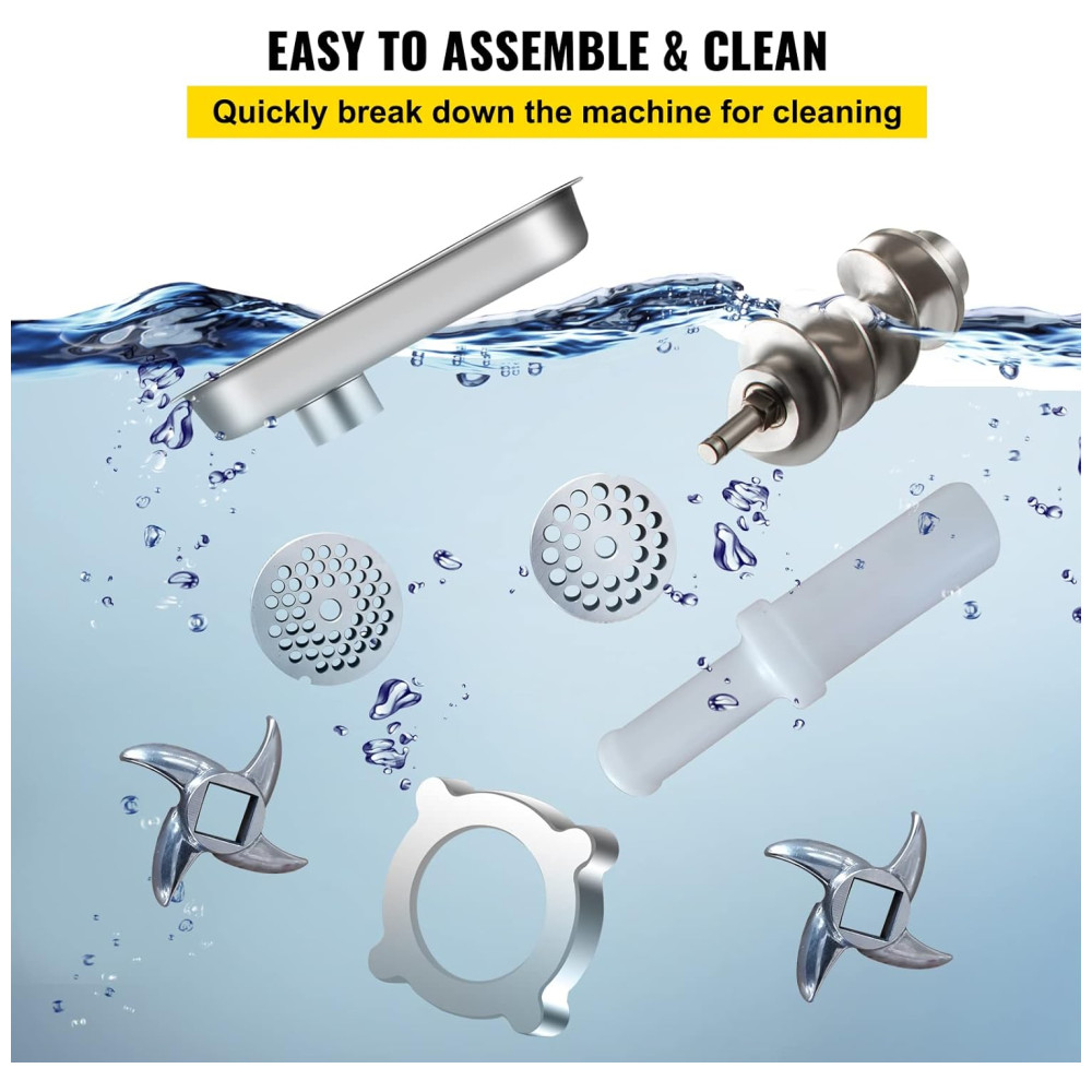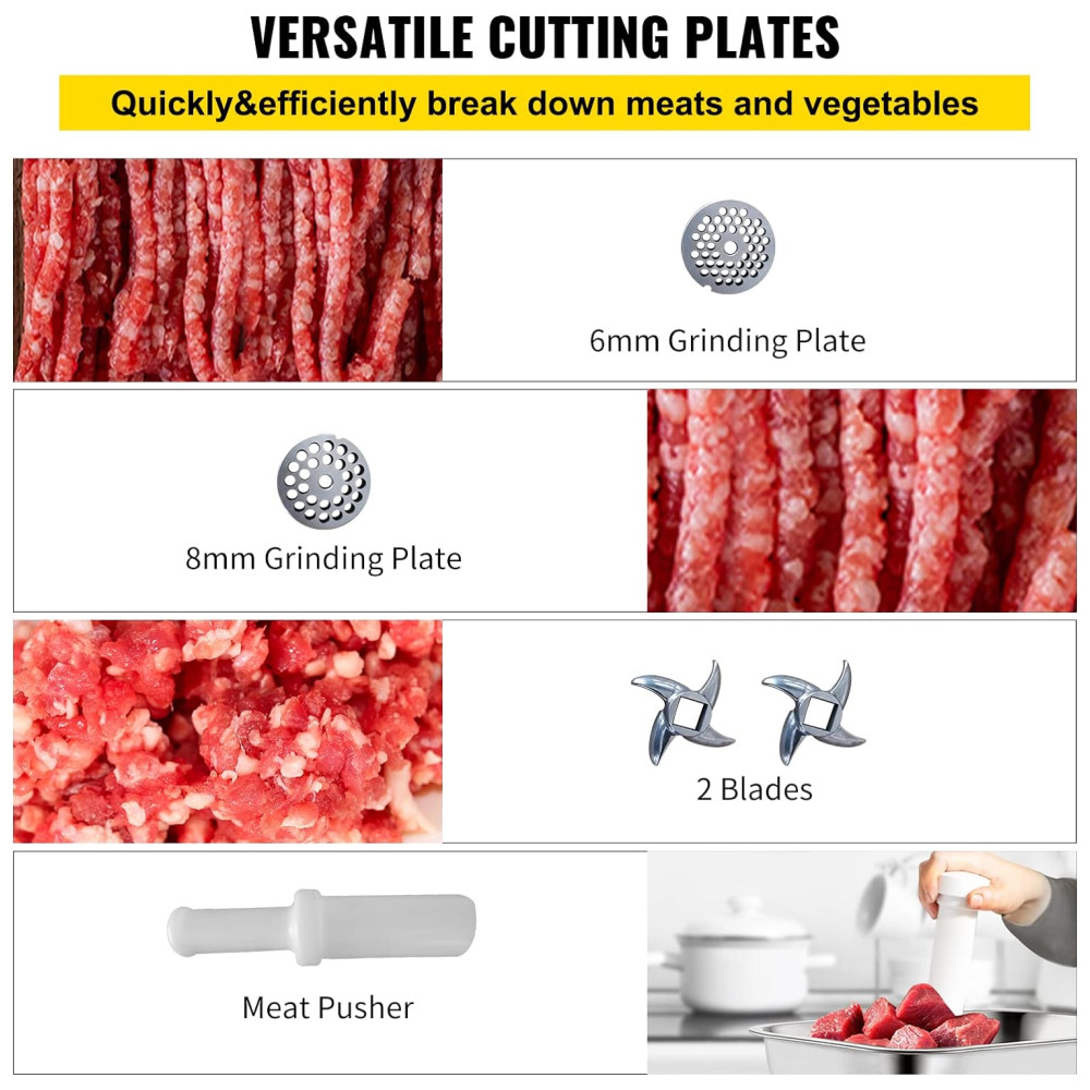 Desempenho poderoso com motor de 1100 W, os moedores de carne podem atingir uma velocidade de 193 r , min e moer aproximadamente até 250 kg , 550 lbs de carne por hora, capazes de moer carne rápida e convenientemente. Pode ser aplicado a ingredientes versáteis, incluindo pequenos ossos de frango e peixes. Com um design de rosca especial, a eficiência é muito maior do que a de uma rosca comum.