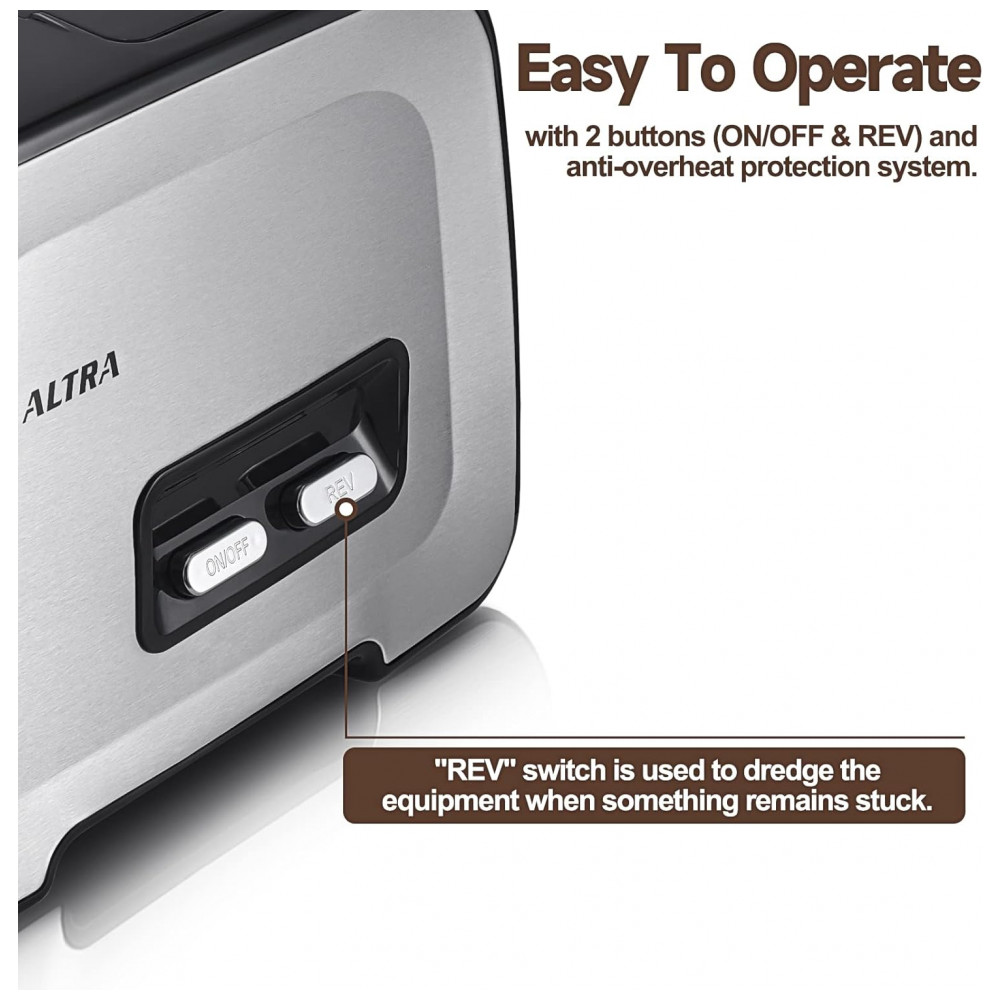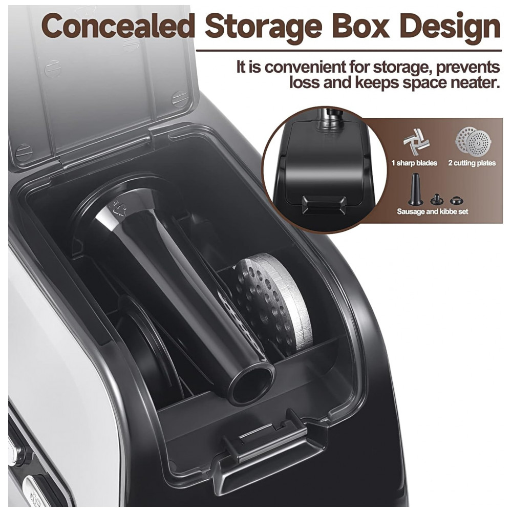 O Moedor de Carne Elétrico ALTRA LIFE é uma potente máquina de 110 Volts e 60 Hz, ideal para os consumidores da América do Norte. Com 350W de potência nominal e impressionantes 2800W de potência máxima bloqueada, é capaz de moer até 3 libras de carne por minuto, tornando o processo rápido e conveniente. Seu motor de cobre puro e engrenagem de metal garantem durabilidade, permitindo seu uso repetido. Este moedor de alimentos totalmente funcional vem com 2 lâminas de corte, 3 discos de moagem de tamanhos diferentes, 1 kit de fazer linguiça, 1 acessório kubbe e 1 empurrador de alimentos, podendo funcionar como moedor de carne, máquina de encher linguiça e fabricante de kubbe. As lâminas e discos de aço inoxidável 420 são afiados e duráveis, ideais para moer diversos alimentos como carne bovina, frango, carne de caça, alho, pimenta, entre outros. Possui uma caixa de armazenamento grande o suficiente para guardar acessórios, como 1 lâmina, 2 discos de corte, 1 tubo de linguiça e 1 kit kibbe, mantendo sua cozinha organizada. Para operação fácil e segura, conta com design de 2 botões (liga/desliga e reverso) e um disjuntor. Em caso de travamento, basta pressionar o botão de reversão para desobstruir. Se houver superaquecimento, o funcionamento será interrompido automaticamente para evitar danos ao motor. Todas as peças do moedor de carne são destacáveis, facilitando a limpeza. Recomenda-se lavar à mão e limpar com um pano, pois algumas partes de liga de alumínio podem oxidar e escurecer na lava-louças. As lâminas e discos de aço inoxidável são seguros para lava-louças.