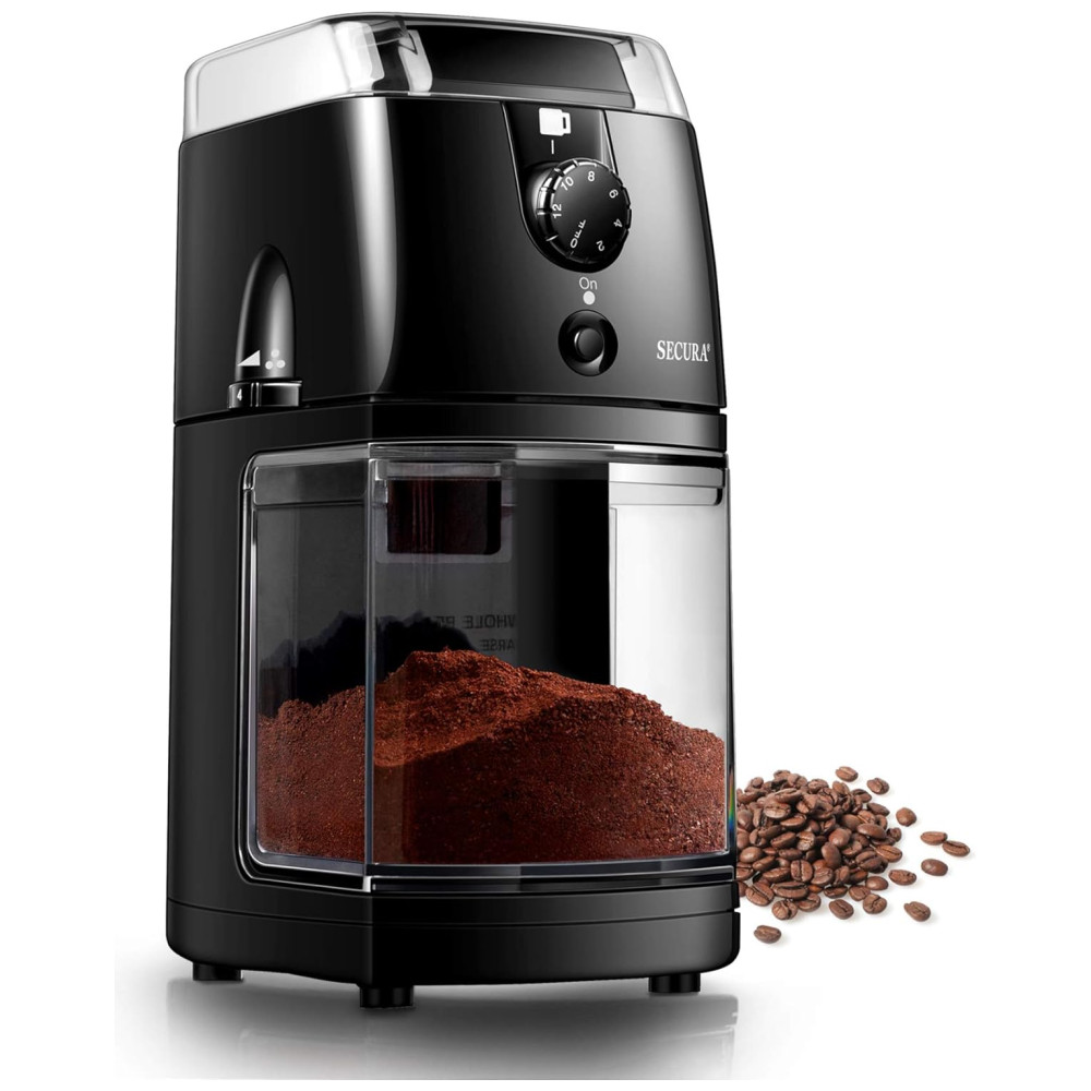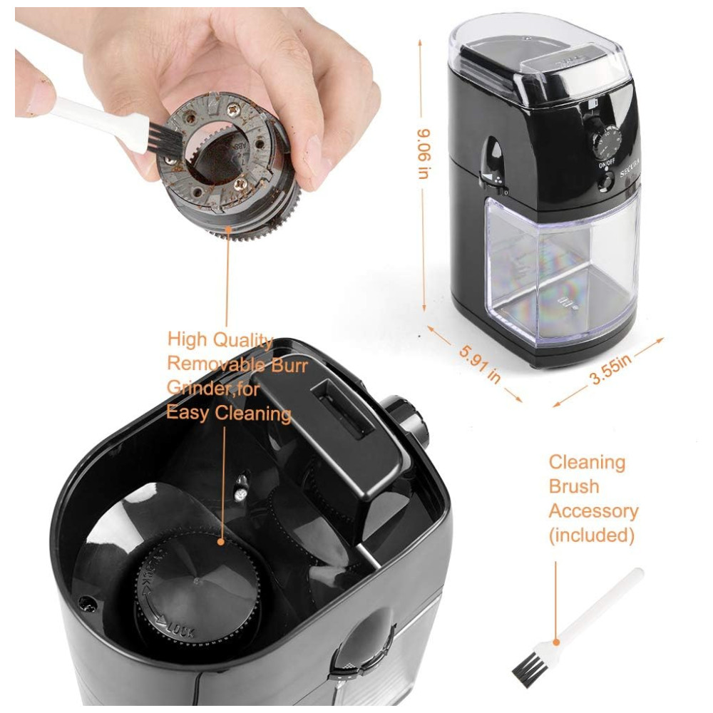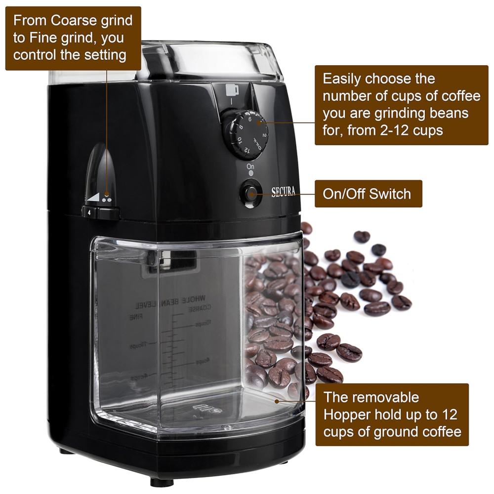 O moedor elétrico de rebarbas Secura vem com 17 seleções de tamanho de Grind, de extremamente fino Expresso a grosso Prensa Francesa. Botão de controle de quantidade de 2 a 12 xícaras. Botão liga , desliga, desligamento automático. O mecanismo de moagem da rebarba tritura uniformemente e preserva o aroma natural. Este moedor automático de rebarbas ocupa pouco espaço no balcão. Sempre disponível quando você precisar de café moído na hora. Somente para uso com os padrões elétricos norte americanos, motor 120V, 110watt. Dimensão 15 x 10 x . Produto aprovado por ETL.