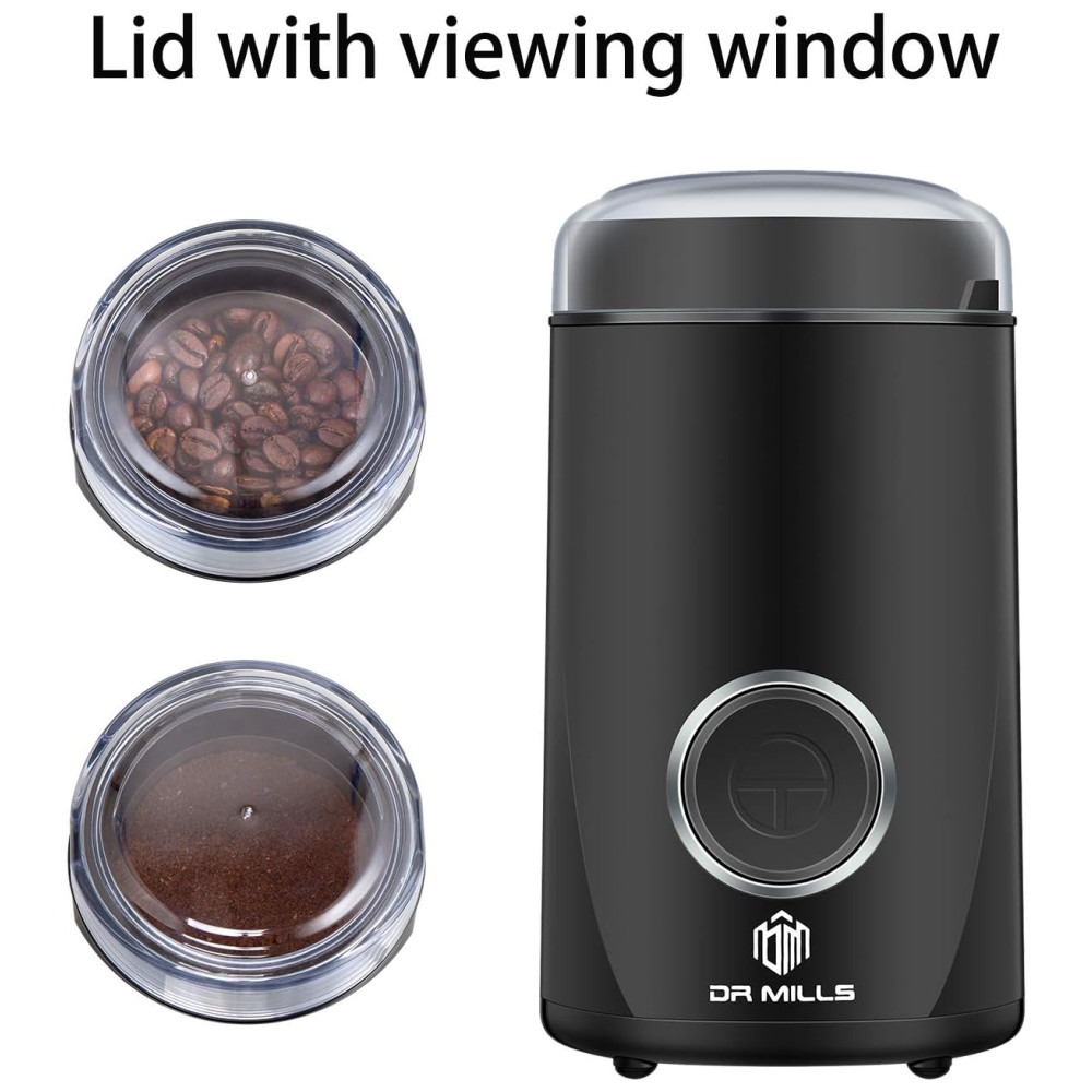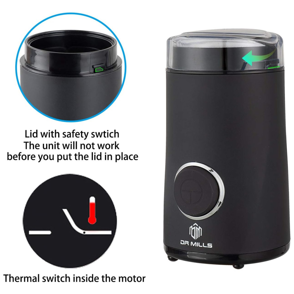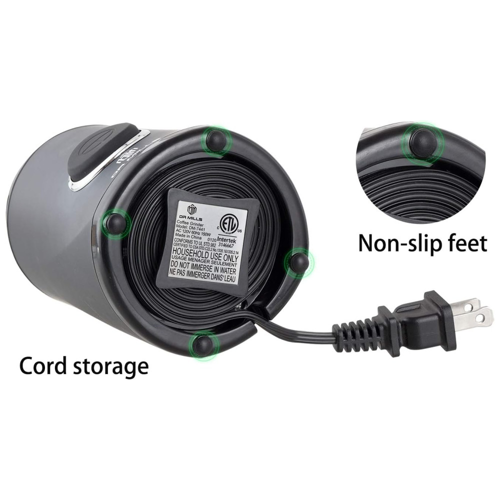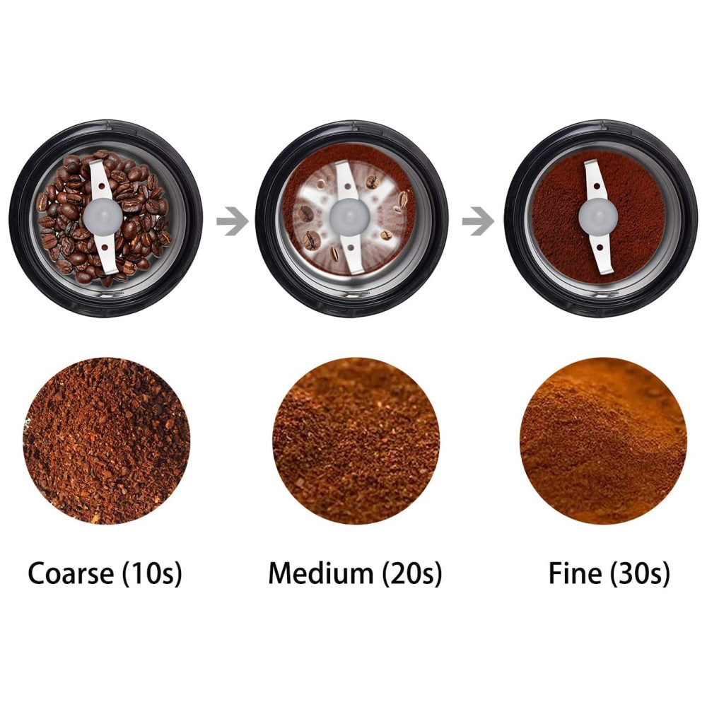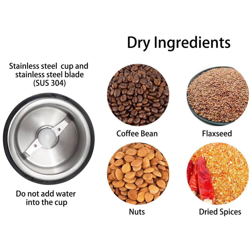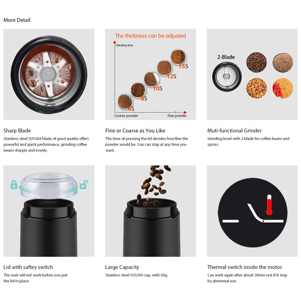 Alimentação 150 W, 120 V, 60 Hz Capacidade de 50g, rendimento de até 7 xícaras de café Ótimo para moer grãos de café, especiarias secas, nozes e grãos. Aprovação ETL Livre de BPA Com escova para fácil limpeza Tampa com janela de visualização Lâmina e copo feitos de aço inoxidável SUS304, sem ferrugem Pés antiderrapantes para uso Com zenamento de cabo Segure o botão para operação, solte para uma parada para facilitar o uso Torne grosso e fino operando em tempos diferentes. Tampa com interruptor de segurança para uso Com o interruptor térmico, pode funcionar novamente após cerca de 30 minutos de descanso se parar por uso anormal.