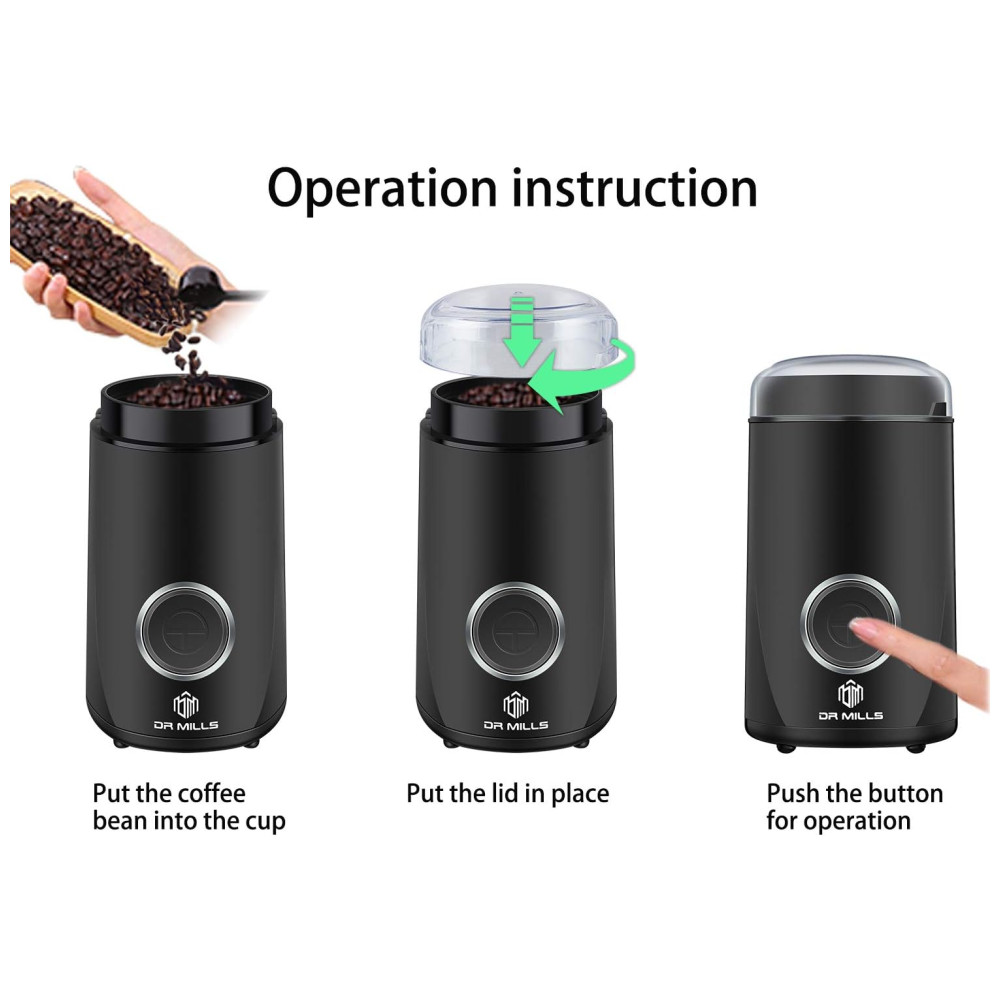 Como usar Coloque os grãos de café na xícara, Gire a tampa transparente no lugar, segure o botão para trabalhar Tamanho da unidade Este é um pequeno eletrodoméstico. Pode usar no escritório. Tampa com janela de visualização, é possível ver o efeito de moagem na parte superior da tampa. Uso múltiplo, pode moer muitos tipos de alimentos, como grãos de café, amêndoas, canela, nozes, colorau, etc. Fino ou grosso como você quiser, pode obter diferentes tamanhos de pó por operar diferentes tempos. Lâmina de aço inoxidável Lâmina de aço inoxidável de boa qualidade, potente e de bom desempenho, copo SUS304 de aço inoxidável, com 50g. Há um interruptor de segurança na parte superior da unidade, ele não funcionará antes de você colocar a tampa no lugar. Limpe o copo de moagem com uma escova ou limpe com um pano úmido. Interruptor térmico dentro do motor, pode funcionar novamente após cerca de 30 minutos de descanso se parar por uso anormal