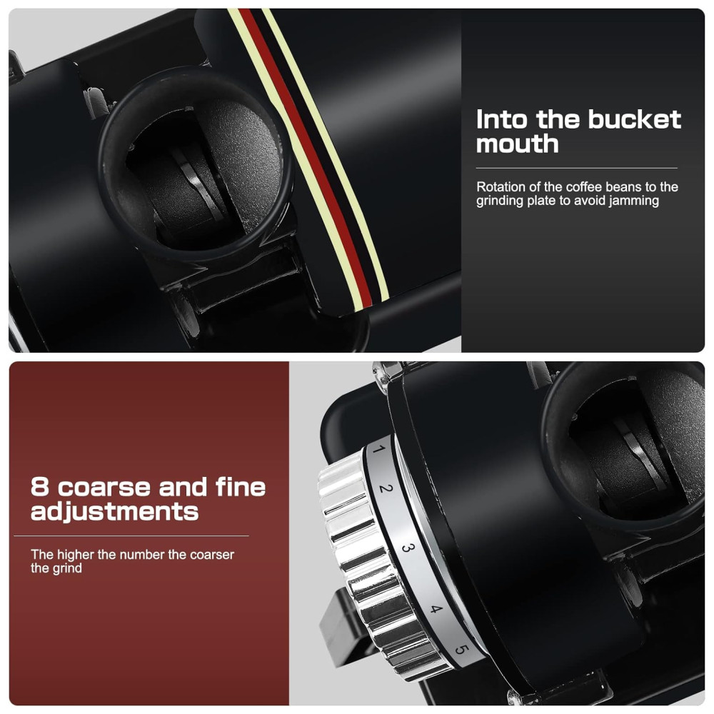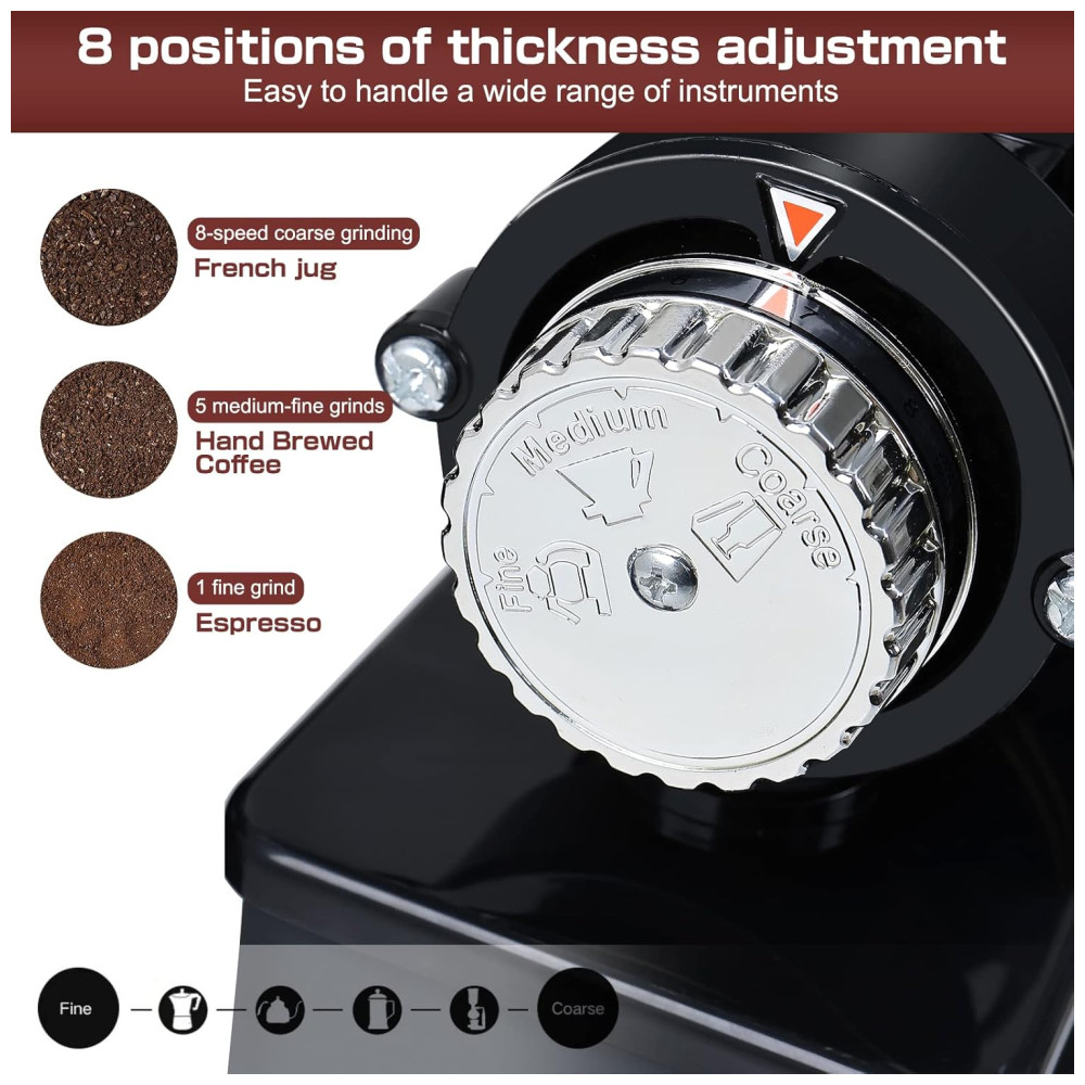 Este moedor de café tem configurações de interruptor, operação segura e conveniente por botão de interruptor de jogo, pressione o botão de fusível, é o dispositivo de fusível, e protegido. Estrutura fina, super potência, baixo ruído, com faca especial de aço duro de desbaste de alta velocidade, não sujeita a entulhos. Base de borracha com de altura na parte inferior, antiderrapante e à prova dágua, mas tente mantê la fora da água. A base está equipada com 2 fusíveis sobressalentes, pode ser substituída. O produto possui 8 níveis de ajuste de espessura, quanto maior o número, mais desbaste, quanto menor o número, mais fino o desbaste.