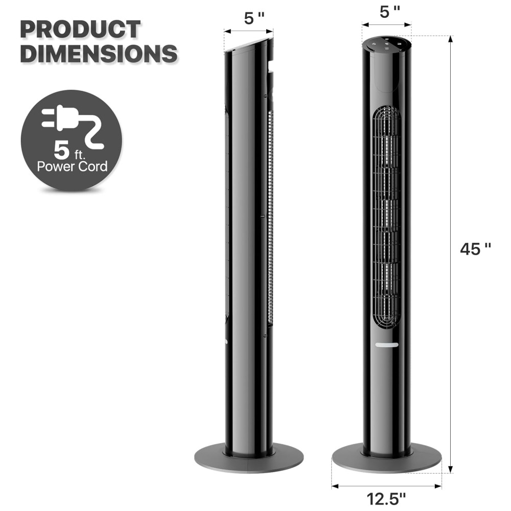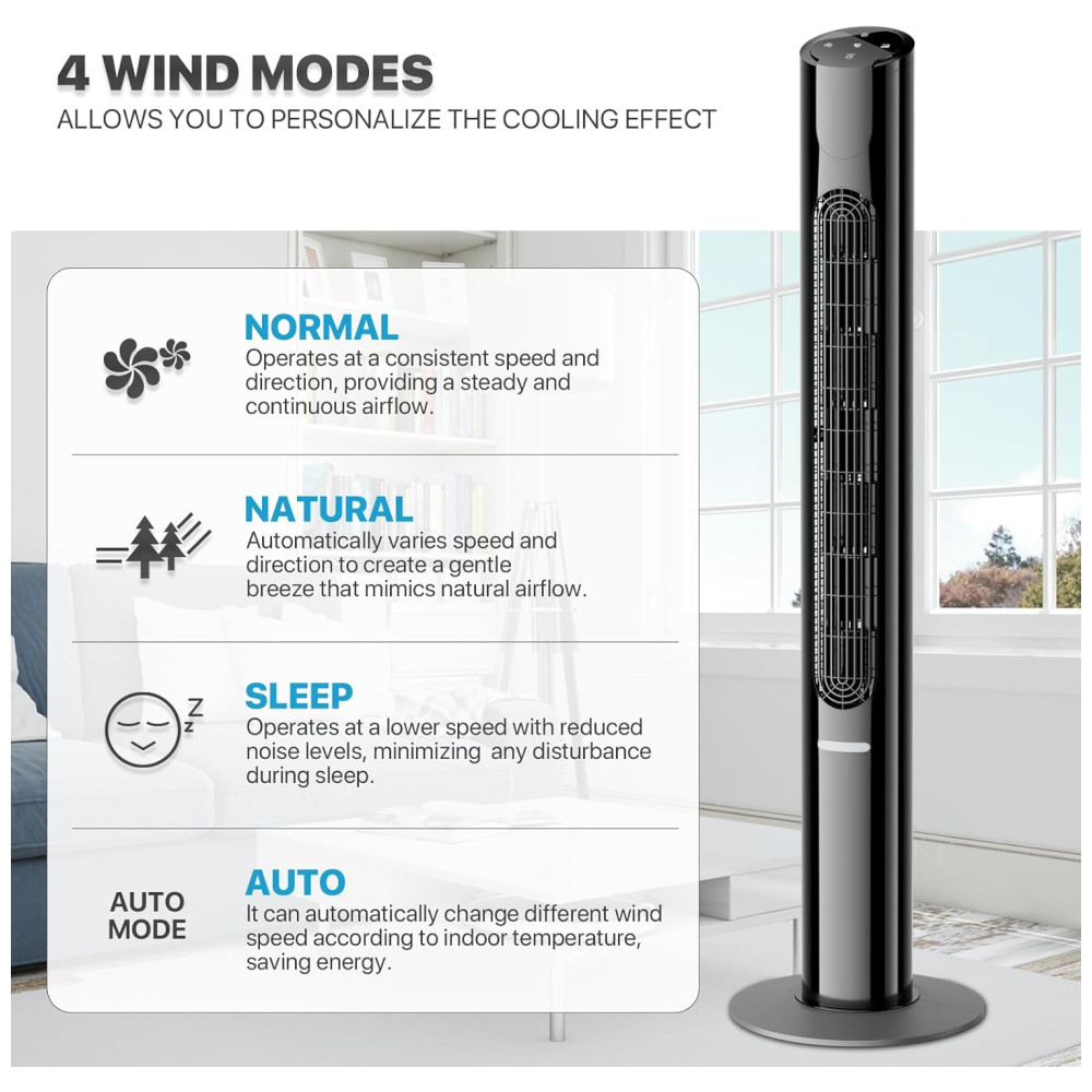 mollie Ventilador de torre silenciosa oscilante com controle remoto 8 velocidades temporizador 12H Tela LED portátil Circulador de ar elétrico de 45 polegadas Ventilador de piso para resfriamento para quarto de casa escritório sala de estar preto