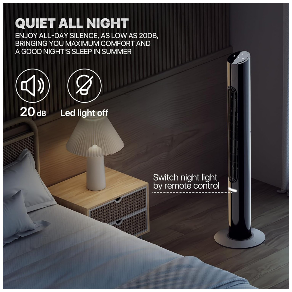 Durabilidade aprimorada Nossos ventiladores de torre com motores DC puros são conhecidos por sua maior durabilidade e longevidade. Esses motores possuem menos peças móveis, reduzindo o risco de falhas mecânicas. Você pode confiar no ventilador em torre para fornecer desempenho de resfriamento consistente por um longo período, tornando o uma escolha confiável e duradoura. 4 modos e 8 velocidades O ventilador da torre possui 4 modos de fluxo de ar normal, natural, suspensão e ECO. Isso permite que você personalize o efeito de resfriamento de acordo com suas necessidades, além de 8 configurações de velocidade, de suave suave a forte, para controlar a energia do vento e fornecer a melhor experiência de resfriamento durante os dias quentes de verão. Ampla oscilação O ventilador oscilante Perfect 70 permite direcionar o fluxo de ar para onde for necessário. A oscilação grande angular e a longa curva do vento proporcionam uma distribuição mais eficaz do fluxo de ar pela sala. O ventilador oscilante ajuda a resfriar e melhora o fluxo de ar em seu quarto ou casa. Ultra silencioso Equipado com motor silencioso, o ventilador da torre foi projetado para operação silenciosa de até 20 dB. Desfrute de uma atmosfera fresca e relaxante sem a distração dos barulhentos motores dos ventiladores. Esteja você trabalhando, estudando ou dormindo, a operação silenciosa do nosso ventilador permite que você se concentre e descanse sem ser perturbado. Controle remoto de toque Com um alcance de 20 pés, o controle remoto incluído oferece a máxima conveniência para a operação. Este ventilador de pé vem com um grande display LED e um painel de controle simples, a luz da tela desligará automaticamente se não for usada por 30 segundos, ajudando você a ter uma noite de sono mais relaxante sem luzes irritantes