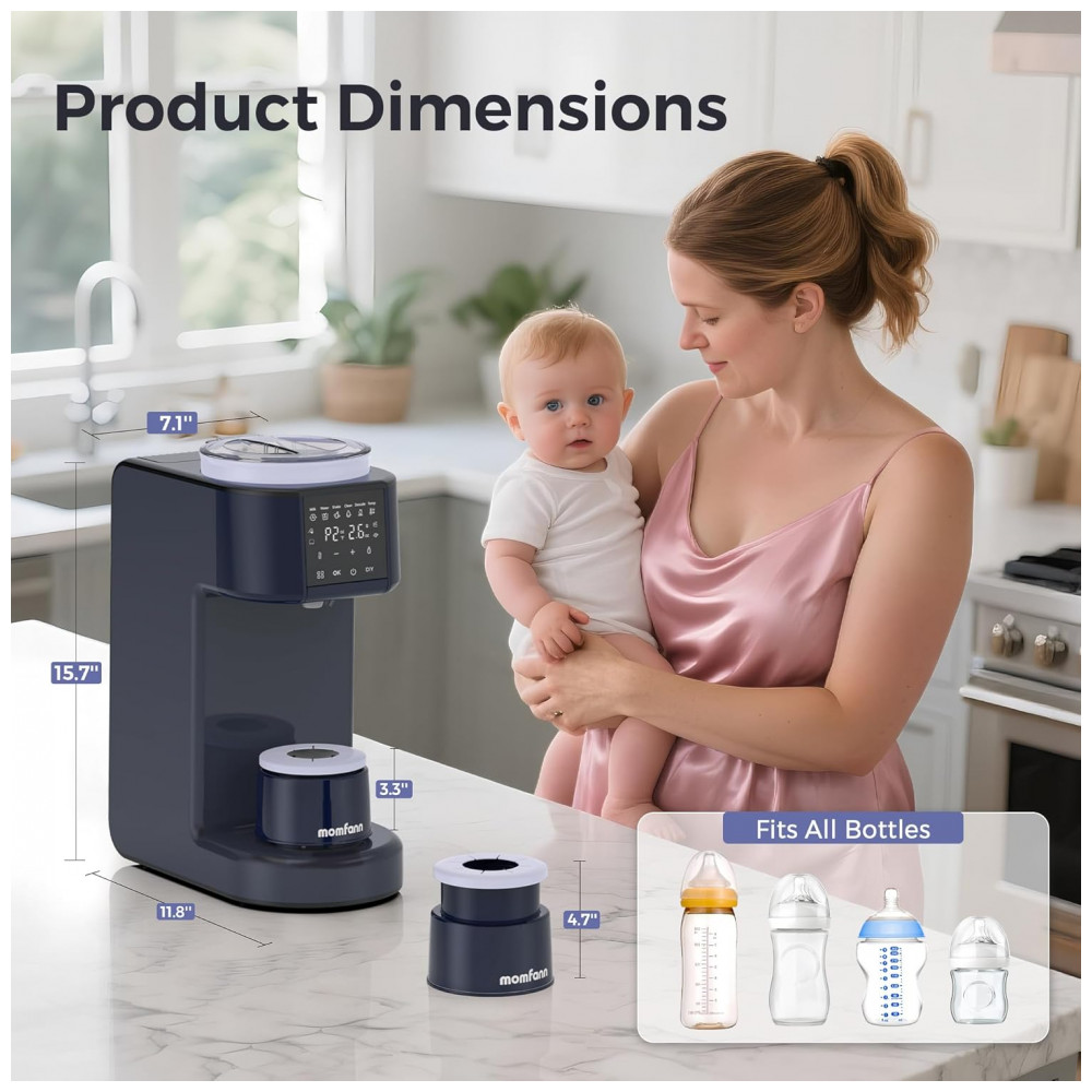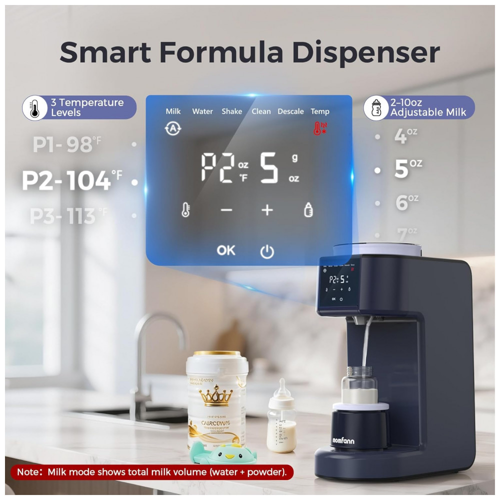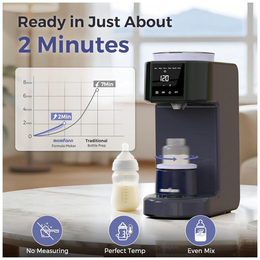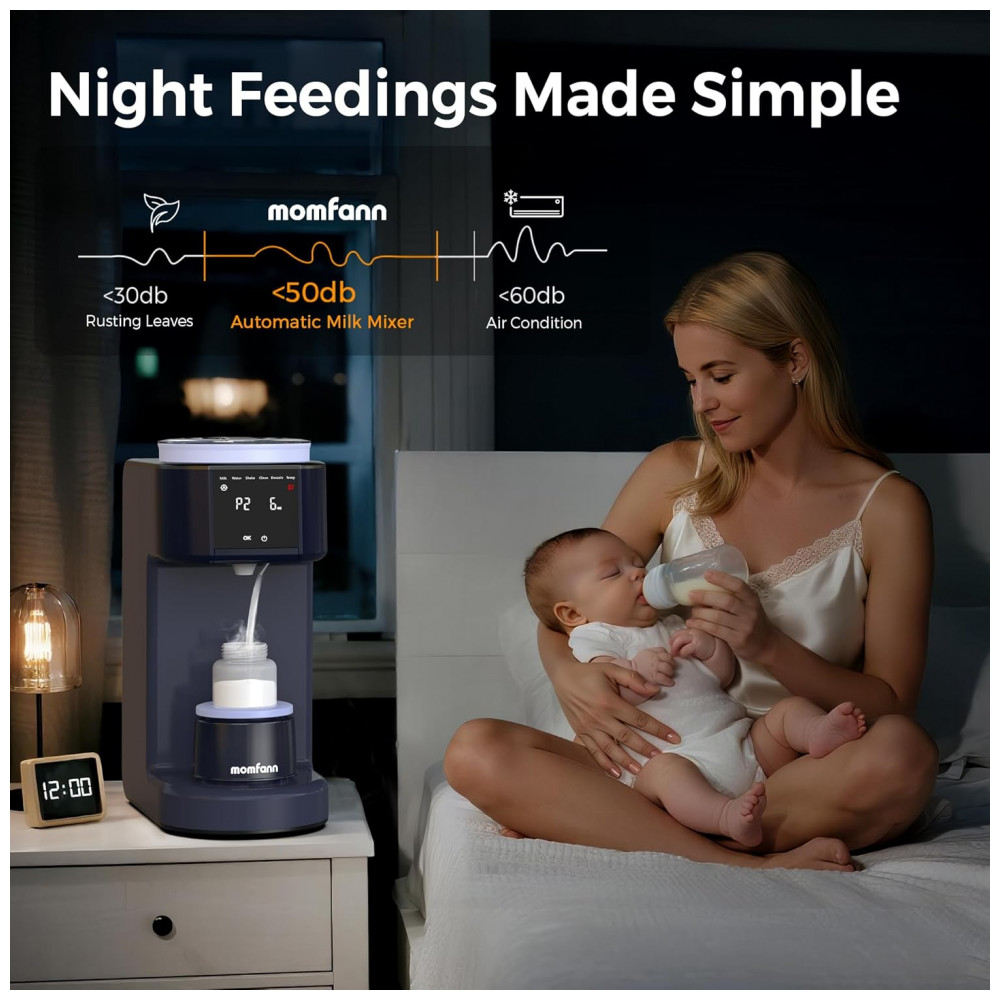 Preparador automático de mamadeiras MOMFANN modelo Y-MOM-K-0020 dosa pó de fórmula de 0,1 g a 99 g com água de 30 ml a 300 ml, personalizável via função DIY que armazena configurações para diferentes marcas de fórmula infantil. Oferece 3 temperaturas (37°C, 40°C, 45°C), opera a 50 dB e inclui base agitadora com timer para mistura uniforme, com alertas de limpeza após 100 L de água e descalcificação após 400 L. Adequado para preparo preciso em alimentação noturna ou diária.