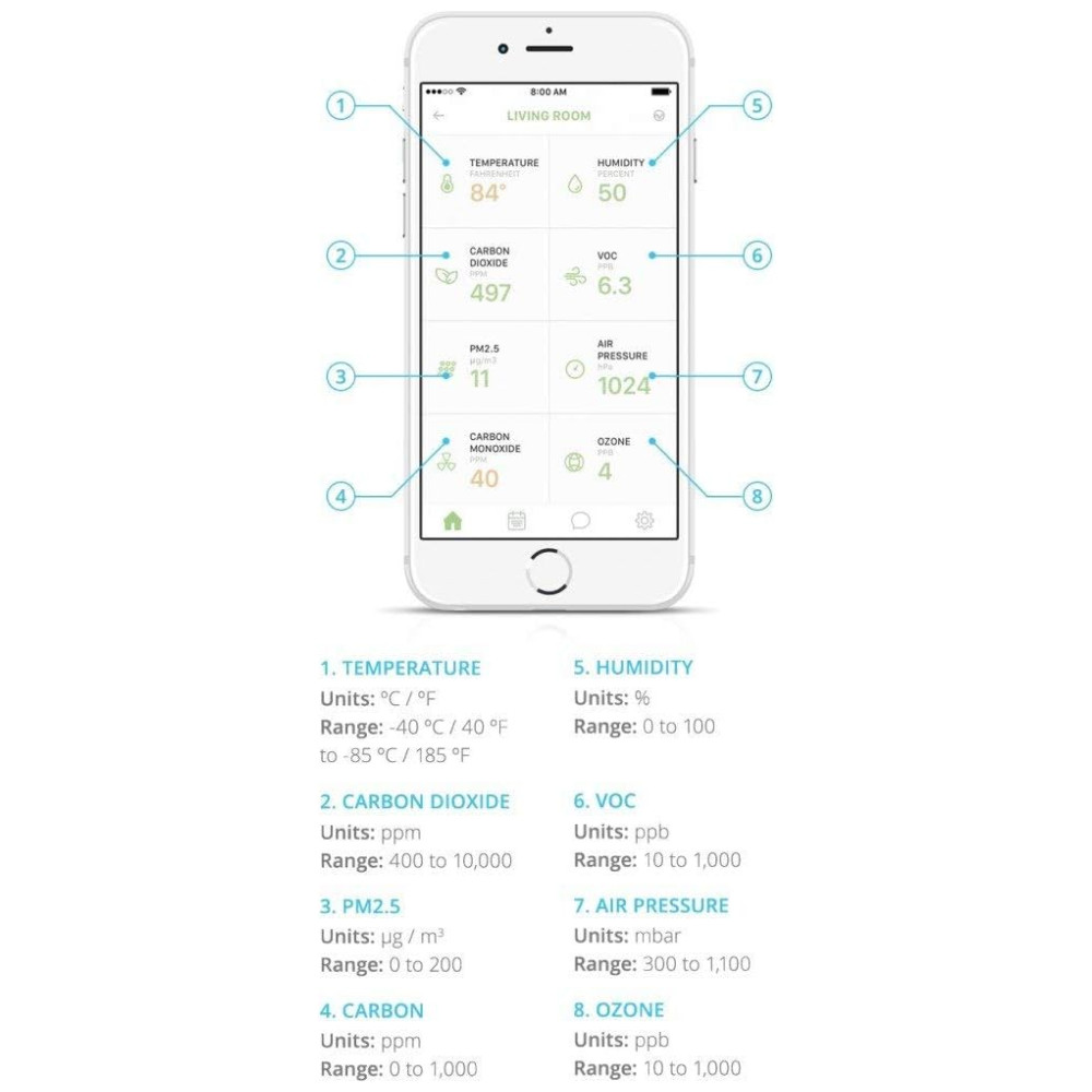 RECUPERE SEU ESPAÇO PESSOAL Não tome a asma e as alergias como garantidas. Essas condições são provavelmente causadas por irritantes e poluentes invisíveis em seu espaço pessoal que o monitor de ar avançado do uHoo pode detectar. Os resultados são exibidos em tempo real no aplicativo móvel com sugestões sobre como melhorar drasticamente o seu humor geral em casa.
