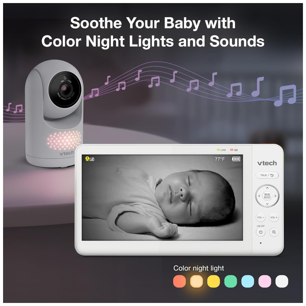Além disso, o monitor de vídeo para bebês VTech Advanced HQ Max 7 oferece sons suaves e sensor de temperatura. 5 melodias calmantes e 5 sons ambientes suaves, incluindo um riacho e ruído branco, criam um ambiente reconfortante para acalmar o bebê. O sensor de temperatura com indicador ajuda os pais a saberem o nível de conforto do berçário.