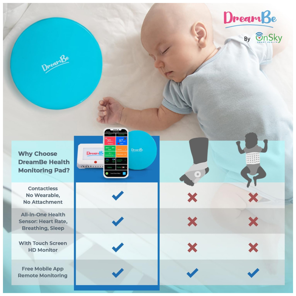 A câmera de vídeo não é suficiente O DreamBe é o primeiro monitor de saúde e sono sem contato do bebê que monitora a respiração, a frequência cardíaca, o sono e o bem estar do bebê em tempo real, sem contato com a pele. O DreamBe consiste em um sensor Pad e um Hub sem monitor touchscreen. Verdadeiramente sem contato basta colocar a almofada de monitoramento no colchão do berço do bebê e cobri la com um lençol ou colocá la sob o colchão. Seu bebê pode dormir tranquila e confortavelmente sem ser perturbado ou constrangido por qualquer wearables.
