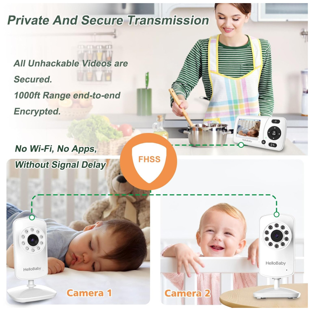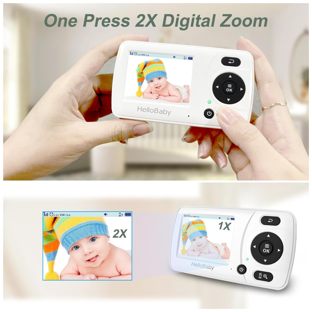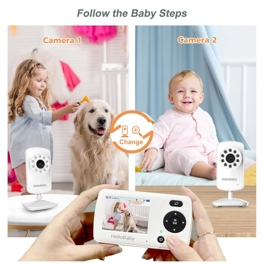 O Monitor HelloBaby com 2 Câmeras é perfeito para acompanhar e garantir a segurança do seu bebê, pet ou idoso. Com 2 câmeras e zoom 2x, você pode monitorar seu bebê e seu animal de estimação simultaneamente. Sem necessidade de WiFi, o monitor de vídeo é fácil de configurar e oferece transmissão estável com tecnologia sem fio exclusiva de 2.4Ghz. A visão noturna por infravermelho mantém a qualidade da imagem mesmo no escuro, enquanto o modo VOX avisa quando o bebê chora. Compacto e ecológico, este monitor é ideal para casa, viagens e acampamentos.