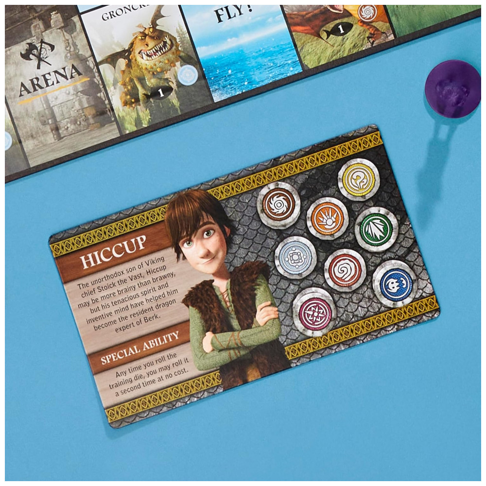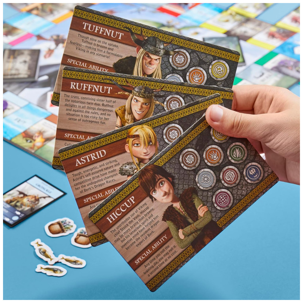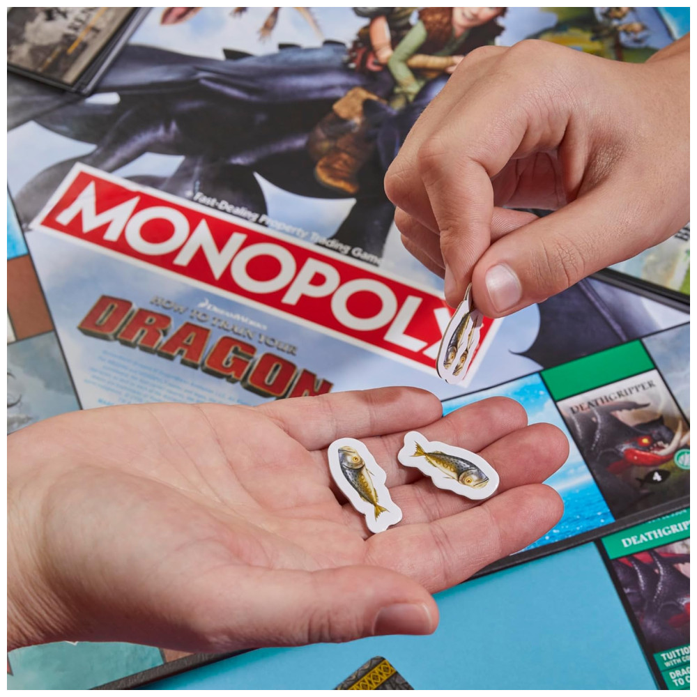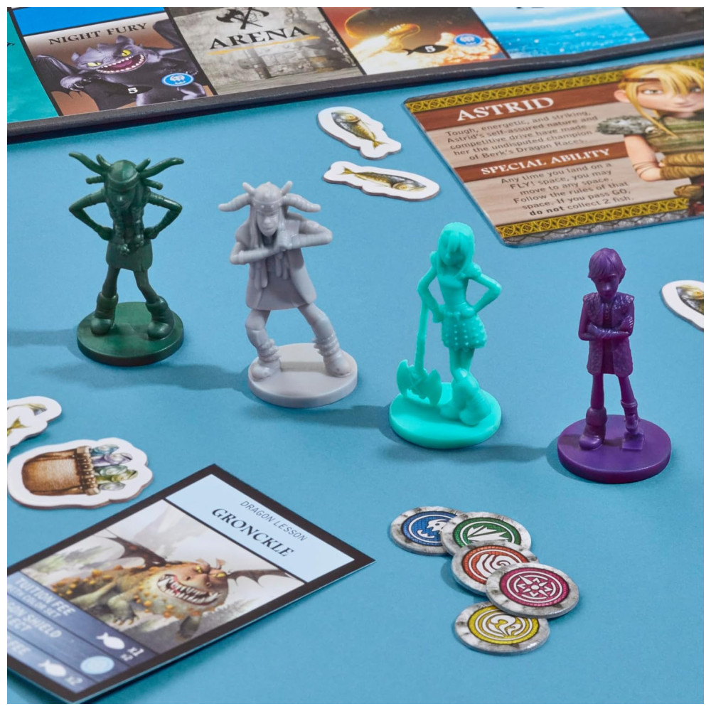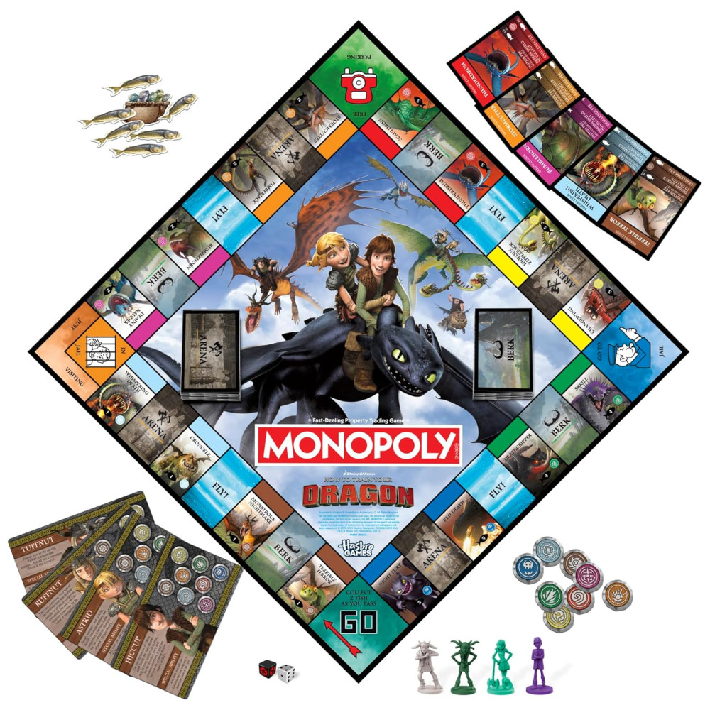 Neste emocionante jogo de tabuleiro Monopoly Edição Como Treinar o Seu Dragão, você voará pelos céus e se tornará o melhor Cavaleiro de Dragões. Assuma o papel de Hiccup, Astrid, Ruffnut e Tuffnut e viva seus sonhos vikings. Pague com peixes por aulas para se tornar um especialista em diferentes espécies de dragões. Treine-os e participe de desafios vikings para testar suas habilidades. O primeiro jogador a treinar um dragão de cada classe ou o último jogador com peixes vence! Este jogo de tabuleiro divertido para famílias, tanto para crianças quanto adultos, é perfeito para momentos em família, férias e muito mais. Excelente presente de aniversário ou feriado para crianças a partir de 8 anos que amam dragões, jogos de tabuleiro infantis e jogos de Monopoly.