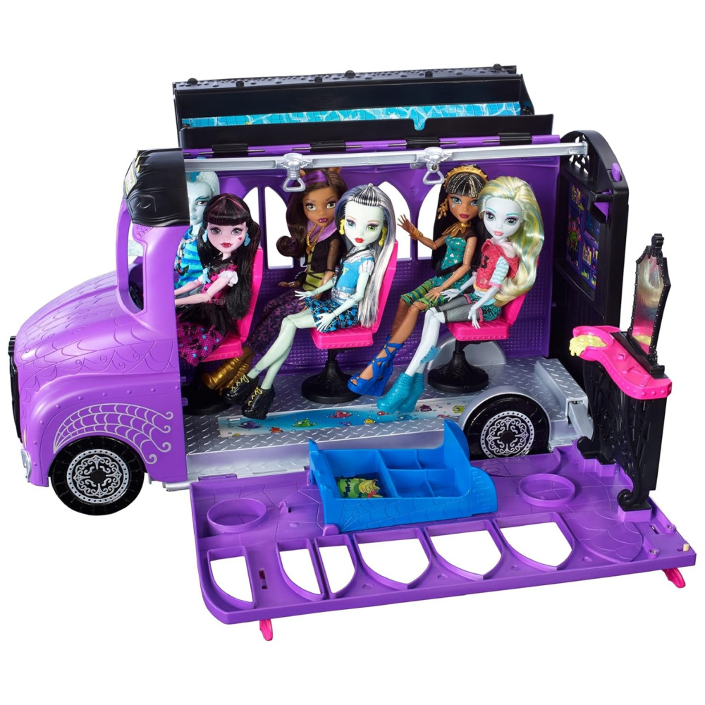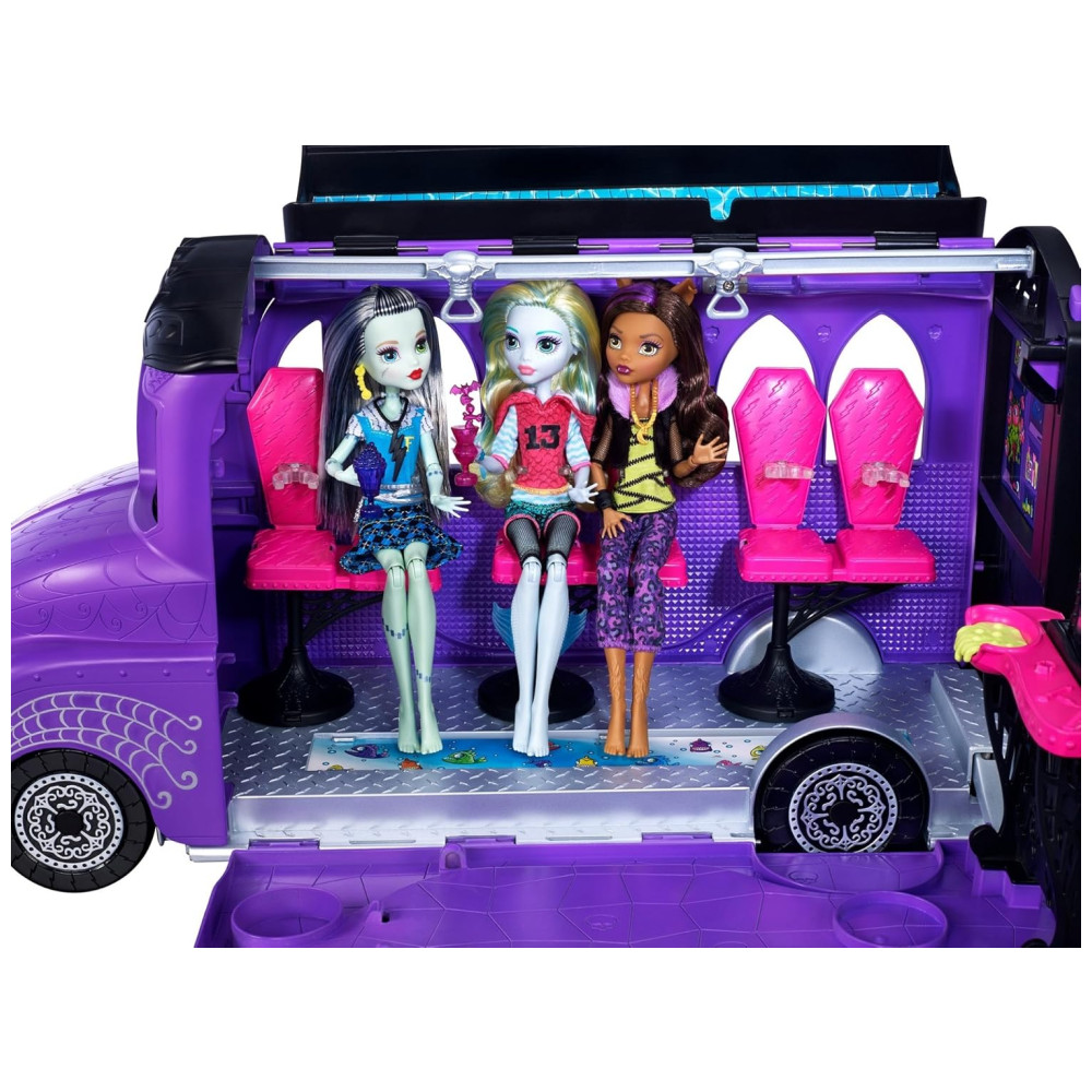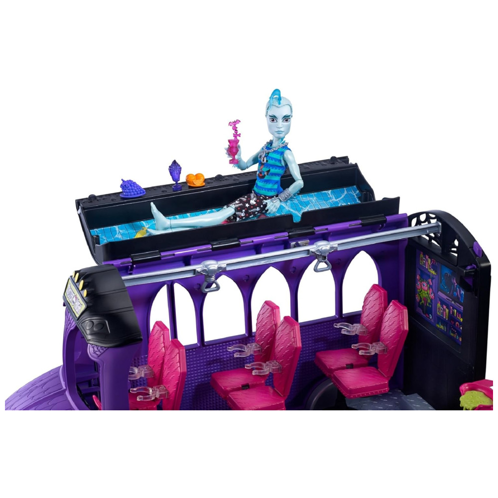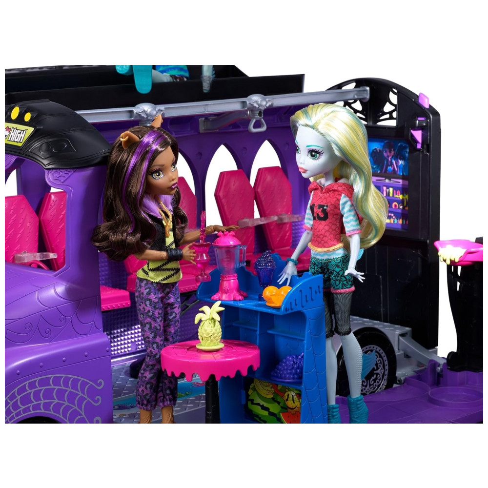 Quando os ghouls estiverem sangrentos, feche o spa e pegue a estrada em um ônibus escolar legal projetado em roxo, azul e preto com toques de Monster High.
