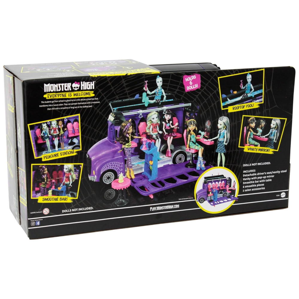 Leve este ônibus Monster High para a escola e prepare se ao longo do caminho ele se transforma em um instante de veículo rolante com espaço para seis bonecas vendidas separadamente em um conjunto de spa com vários espaços de jogo.