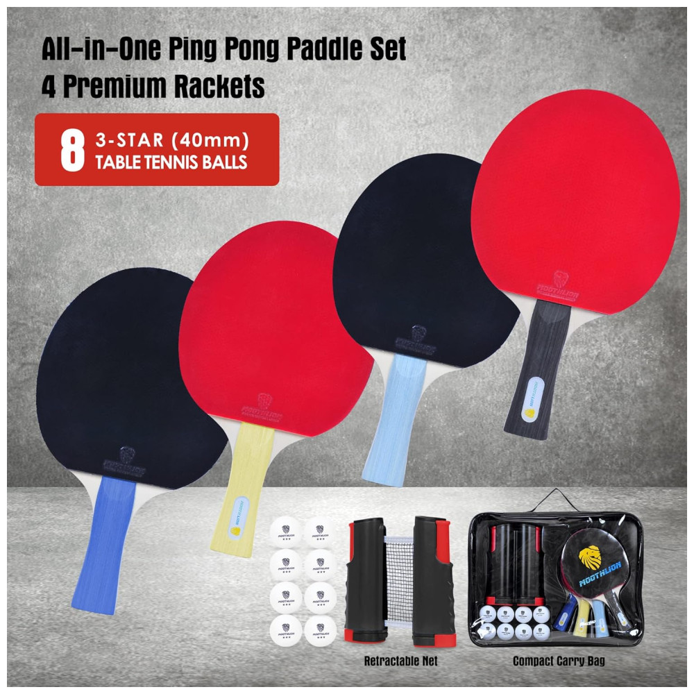 CONJUNTO DE PÁ DE PING PONG Este conjunto de tênis de mesa completo inclui 4 pás de pingue pongue de alto desempenho, 8 bolas de pingue pongue, uma rede de pingue pongue retrátil com postes e uma bolsa de transporte compacta portátil. É conveniente para membros da família ou amigos jogarem tênis de mesa a qualquer hora em qualquer lugar