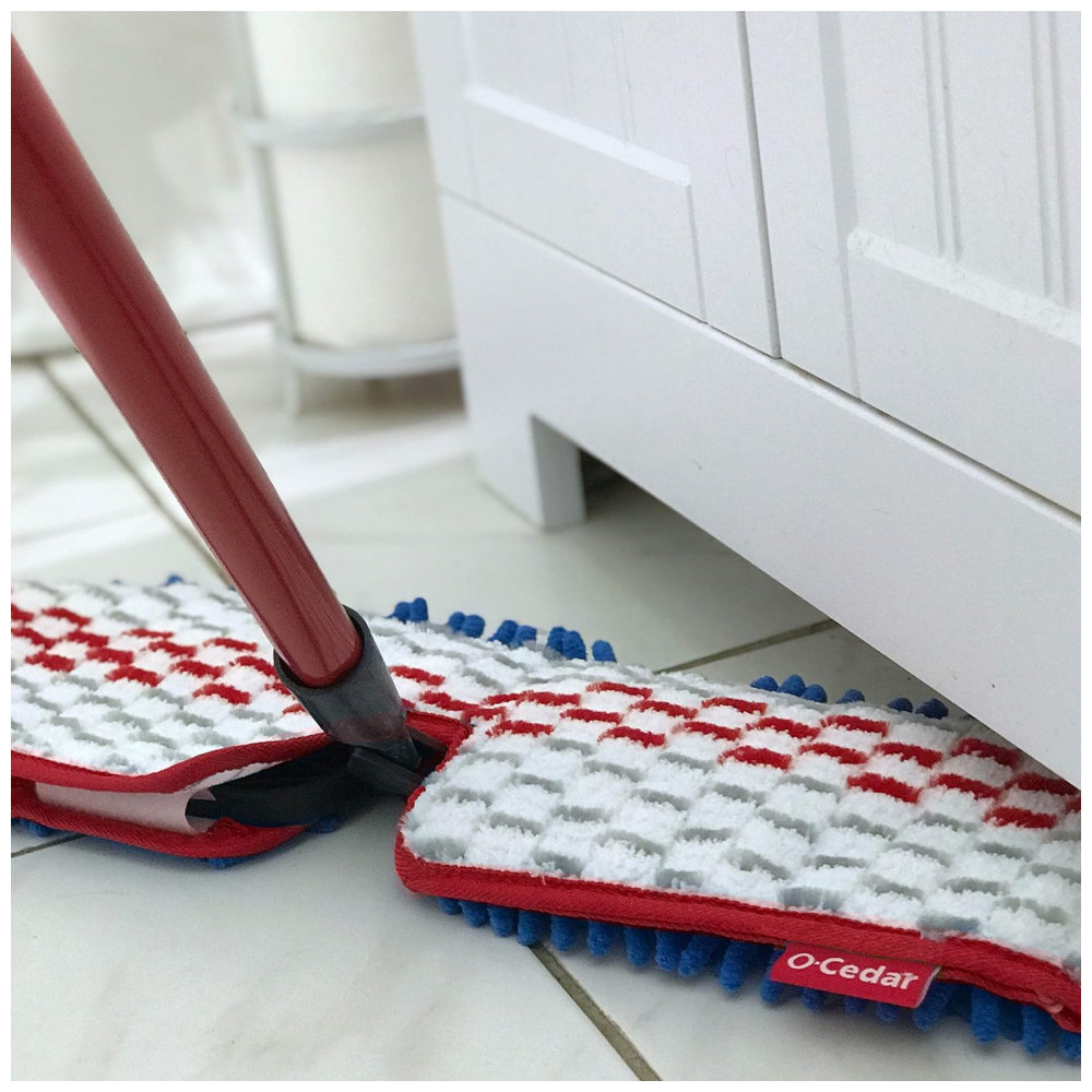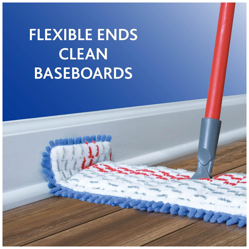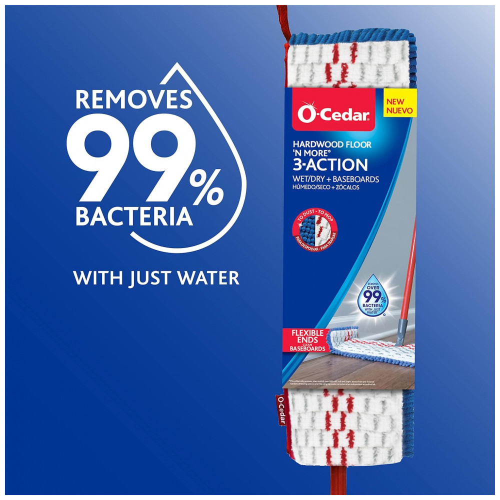 ÁREA DE SUPERFÍCIE ENORME PARA LIMPEZA FÁCIL A cabeça de esfregona dupla do O Cedar Hardwood Floor N More Mop de 3 ações apresenta chenille ultra denso para atrair sujeira, poeira e cabelos e microfibra poderosa para acabar com sujeira, poeira e sujeira. A cabeça da esfregona extra larga limpa grandes áreas da superfície mais rapidamente