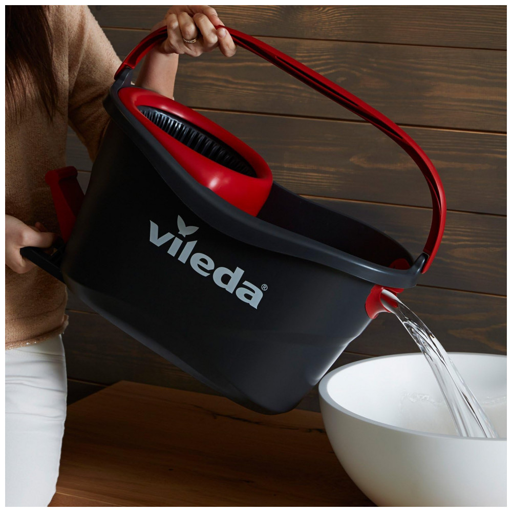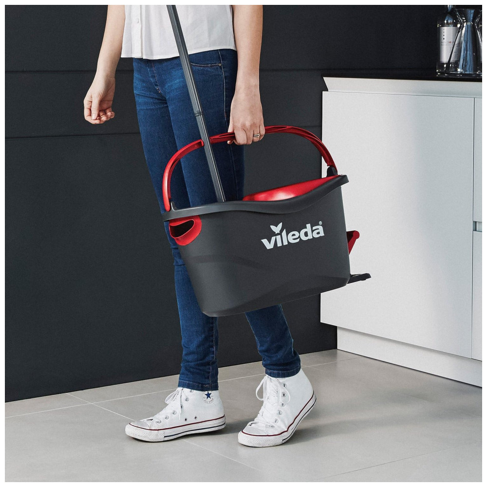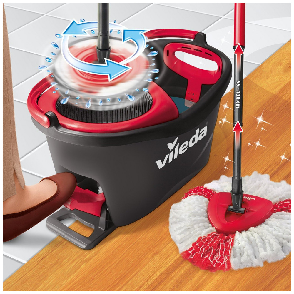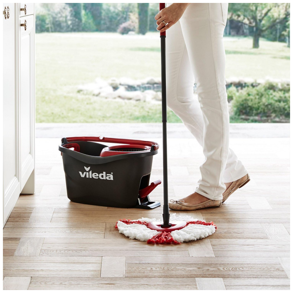 O esfregão Vileda Turbo, com espremedor acionado por pedal, ajuda você a limpar completamente o chão com o mínimo de esforço. Apresentando uma cabeça de esfregão de microfibra 2 em 1 com fios vermelhos exclusivos para coleta extra de partículas e uma limpeza profunda.
